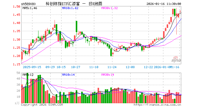 1月16日,截止午间收盘,科创综指ETF汇添富(589080)涨0.96%,报1.468元,成交额1915.57万元。科创综指ETF汇添富(589080)重仓股方面,海光信息截止午盘跌2.44%,寒武纪涨0.26%,中芯国际涨1.21%,中微公司涨2.54%,澜起科技涨3.30%,百利天恒跌0.76%,金山办公跌1.13%,联影医疗跌1.93%,影石创新跌0.38%,传音控股跌1.32%。