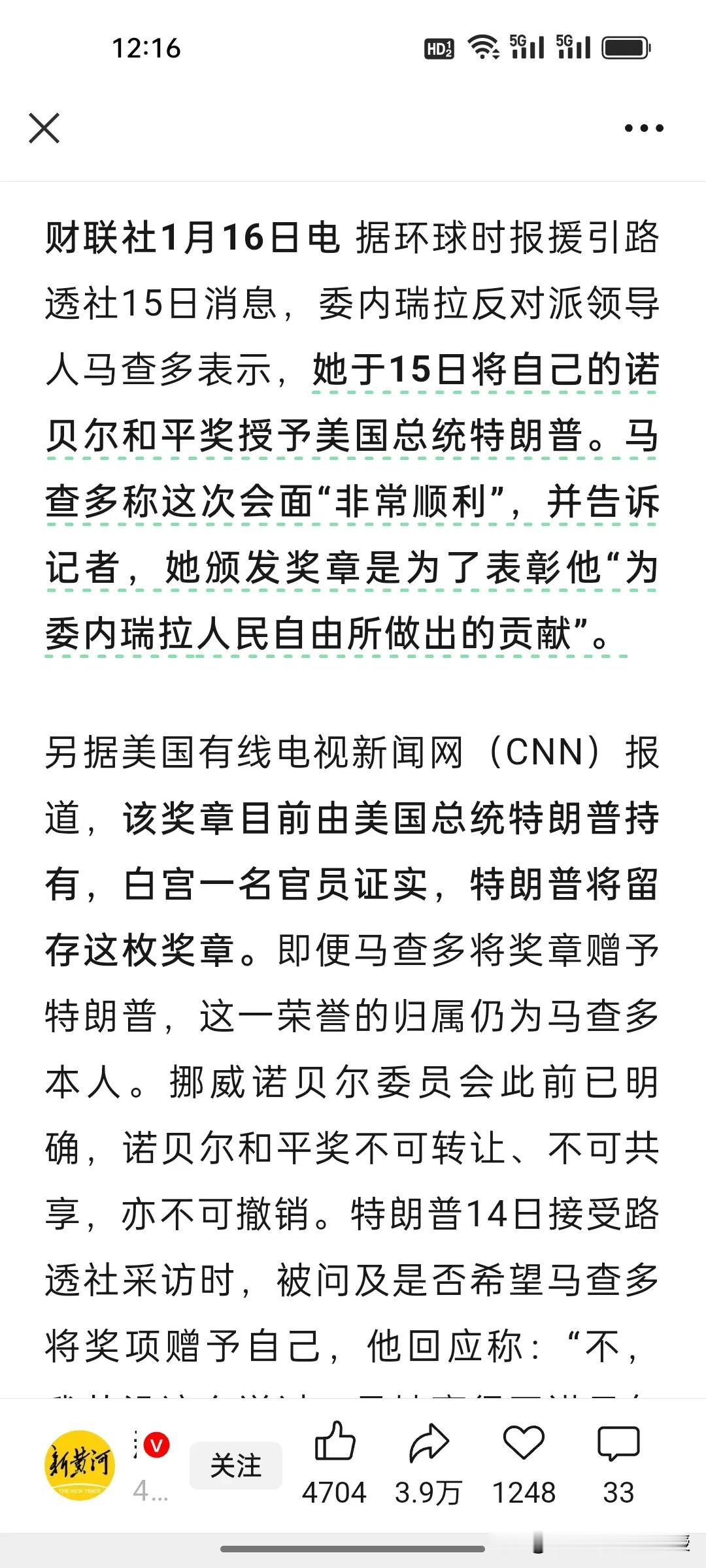 特朗普终究还是得到了诺贝尔和平奖章!根据《环球时报》消息,诺尔贝和平奖得主,委内瑞拉的马查多已经于昨天把奖章在白宫亲自赠予了特朗普,特朗普将留存这枚奖章。挪威诺贝尔和平奖组委会还不得发怒,早就已经发文明确说过不让转赠。 这是诺贝尔奖历史上第一次闹大笑话,挪威诺奖组委会肯定后悔,早知道这样就不给马查多颁奖了!马查多说特朗普为委内瑞拉人民的自由做出了贡献,这场闹剧终究让诺贝尔和平奖的光环碎了一地,沦为依附强权、透支公信力的政治道具。