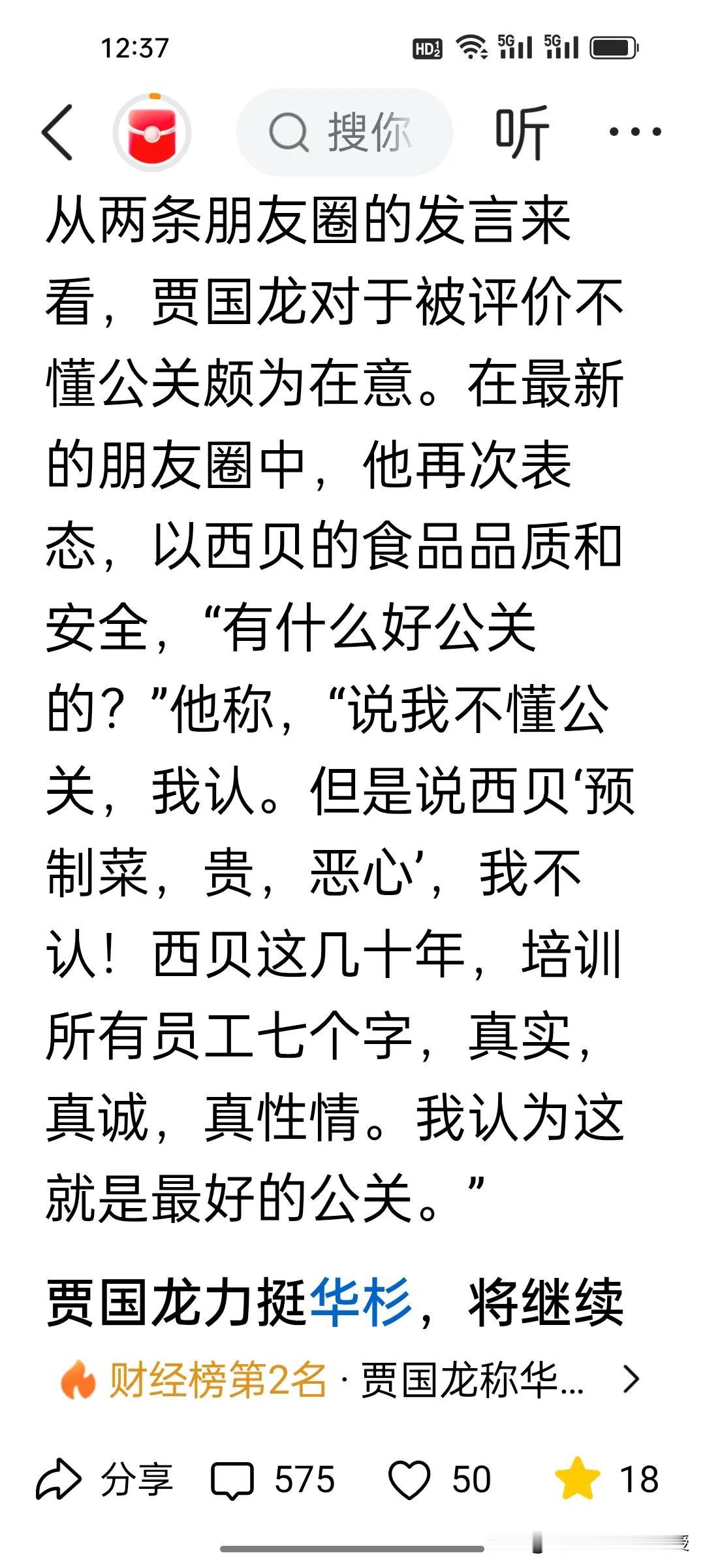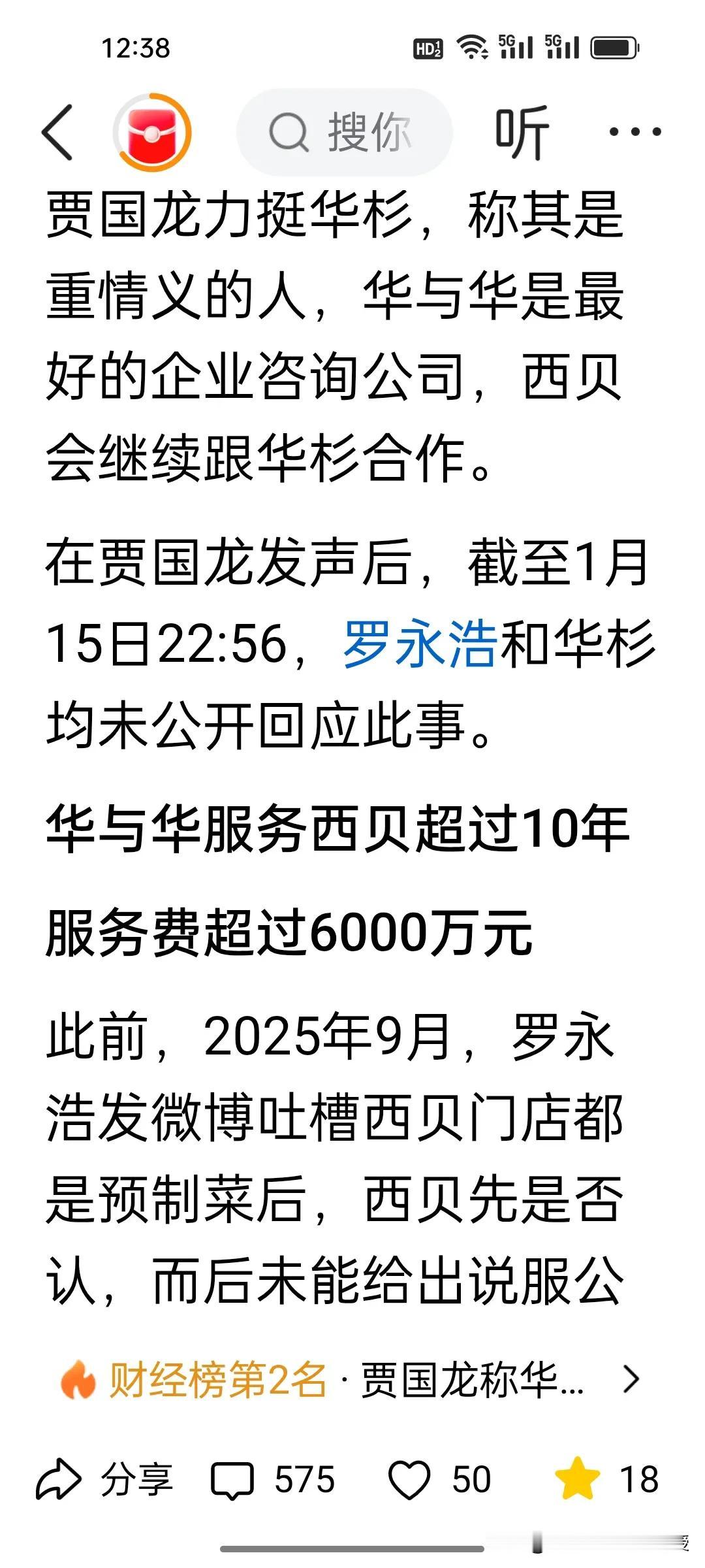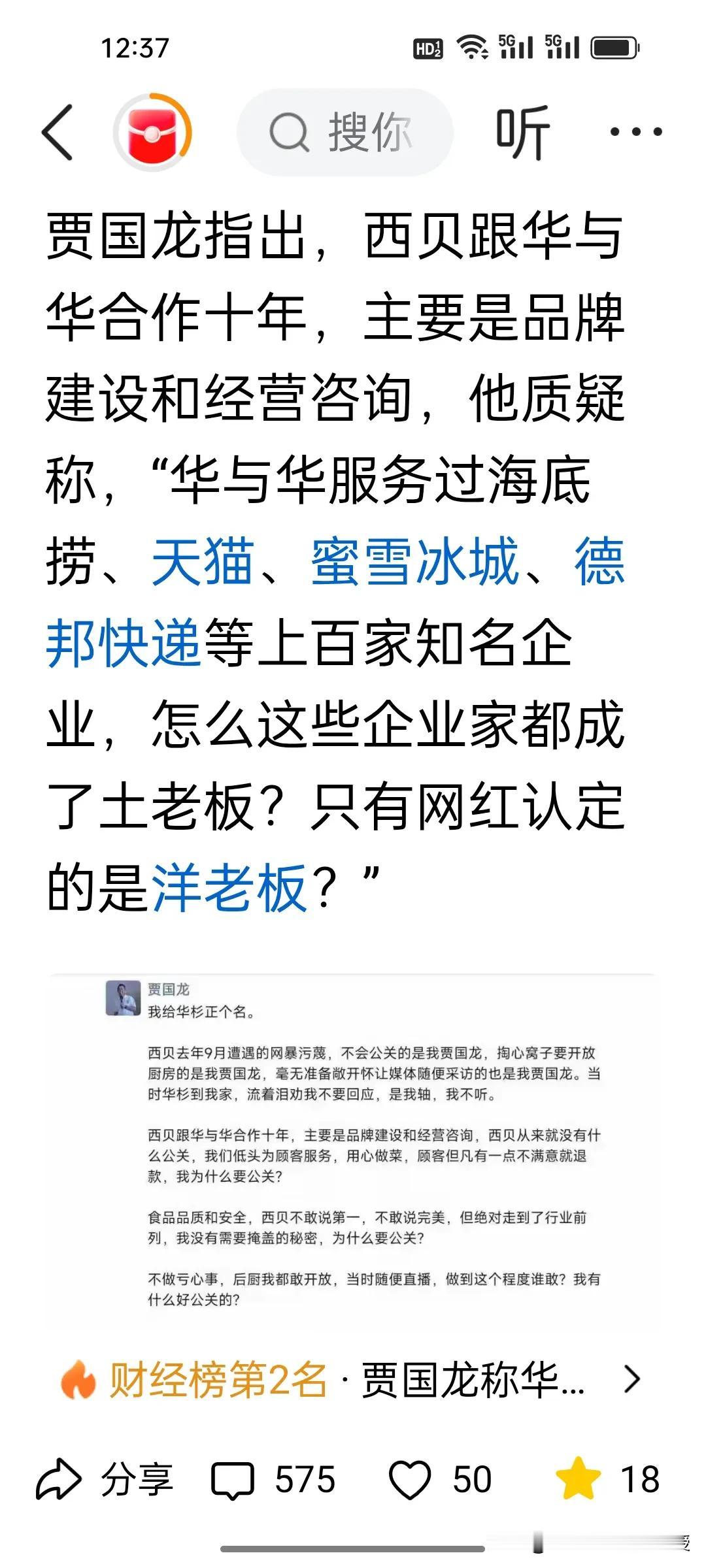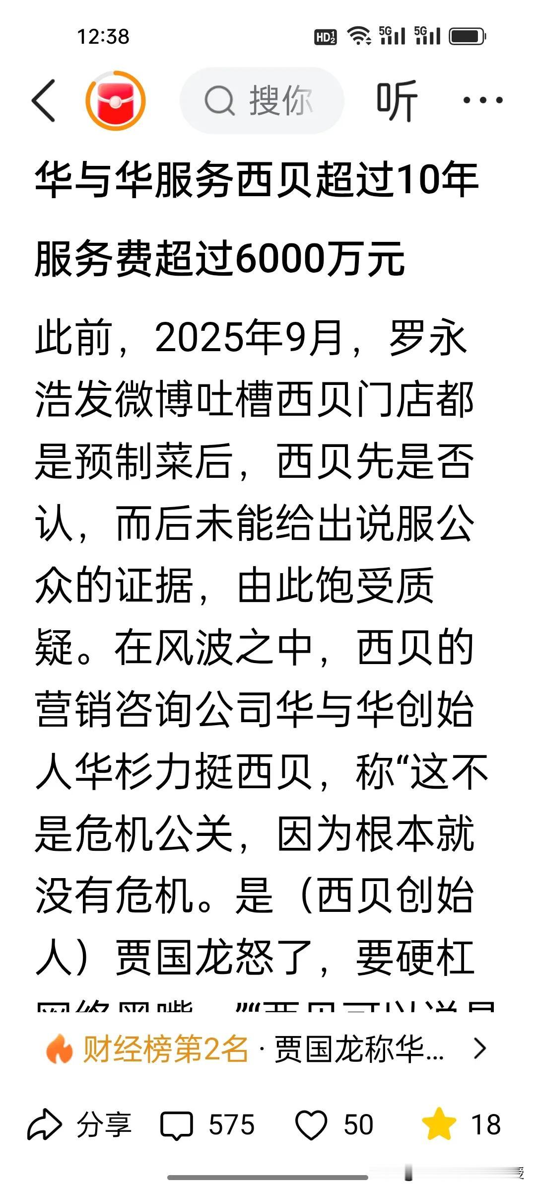 贾国龙为什么力挺华与华?面对西贝关店102家,贾国龙发朋友圈长文证实,全文满是不甘心,有愤怒,没有点名道姓罗永浩,却力挺华与华! 本来大家都已经快忘记西贝预制菜,贾国龙昨天一条朋友圈炸翻商界!直言“不懂公关是我的事,与华与华无关”,力证十年合作伙伴清白。要知道当初风波正劲时,华杉曾流泪劝他别回应,如今却遭内涵“服务土老板”,贾国龙直接硬刚到底,更是表态要继续合作华与华,他这么做也是给华与华的客户一点信心吧,不然华与华真没客户了。 罗永浩目前就贾国龙发朋友圈一事还没有回应,也至今没有公开华杉的录音。不过贾国龙出面力挺华与华,更多的是出于江湖义气。在流量至上、树倒猢狲散的商界,他不甩锅、不避嫌,把责任扛在自己肩上,华杉又该感动流泪了吧?
