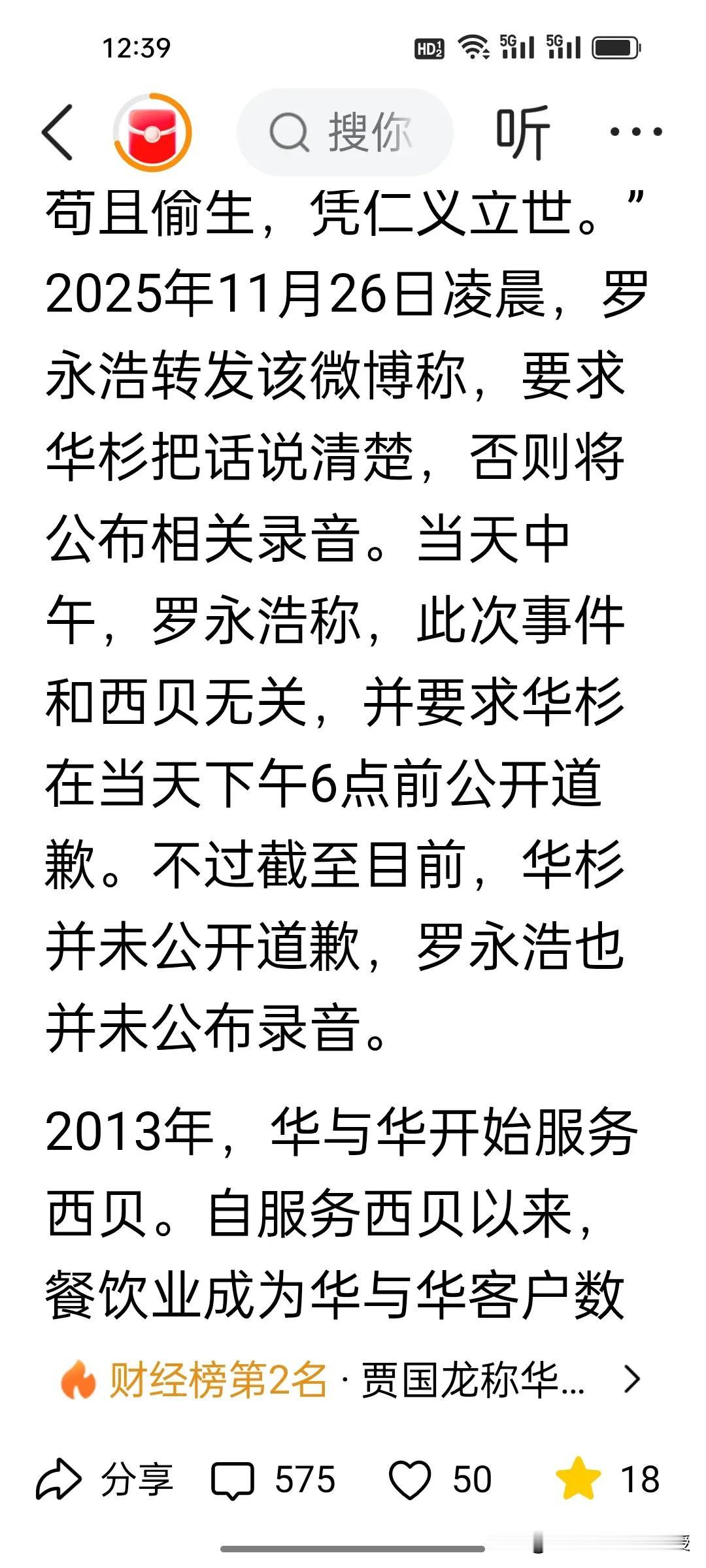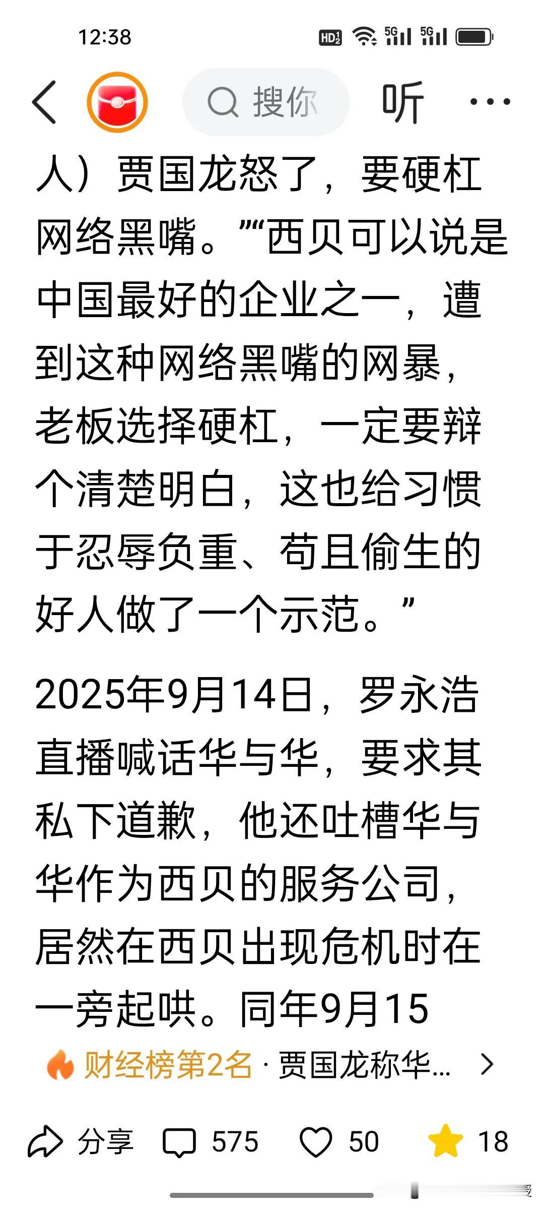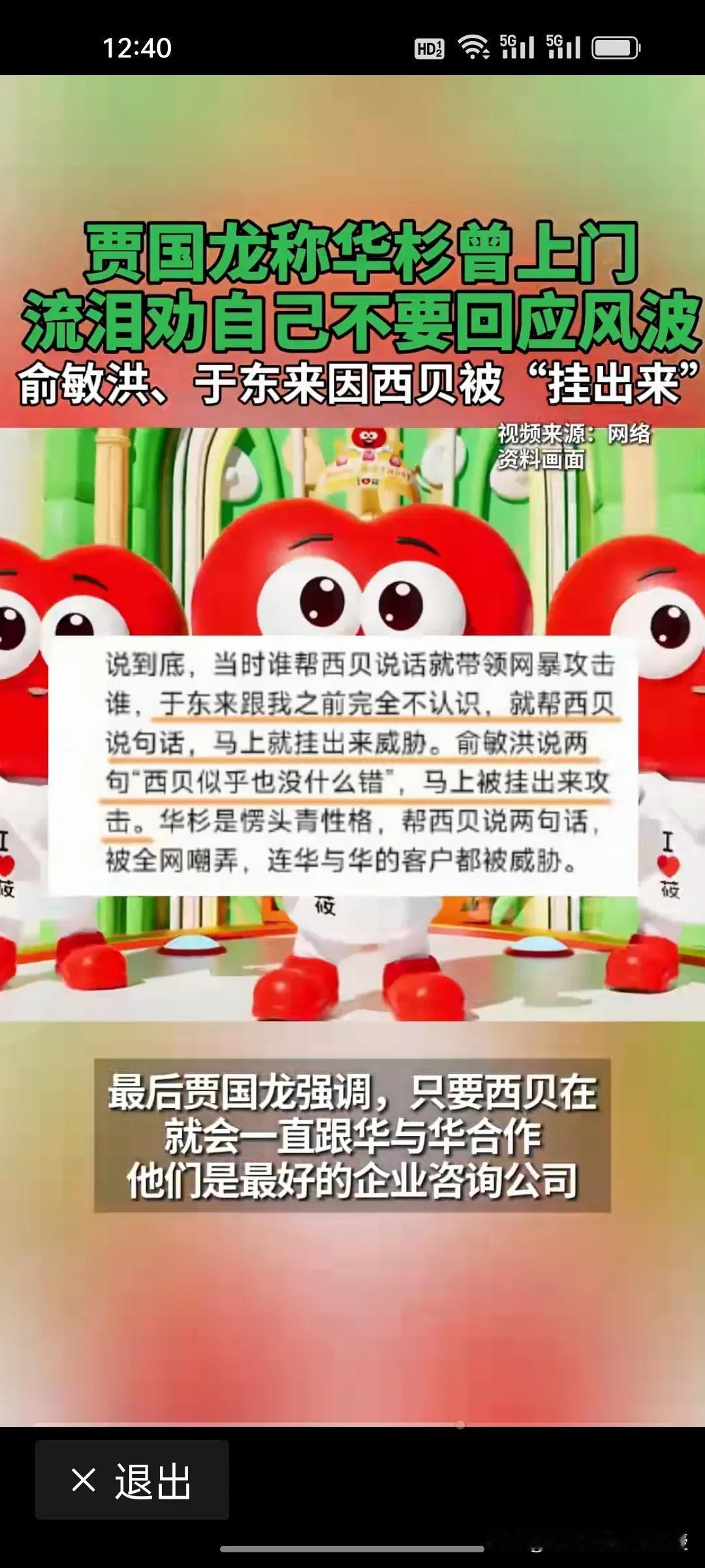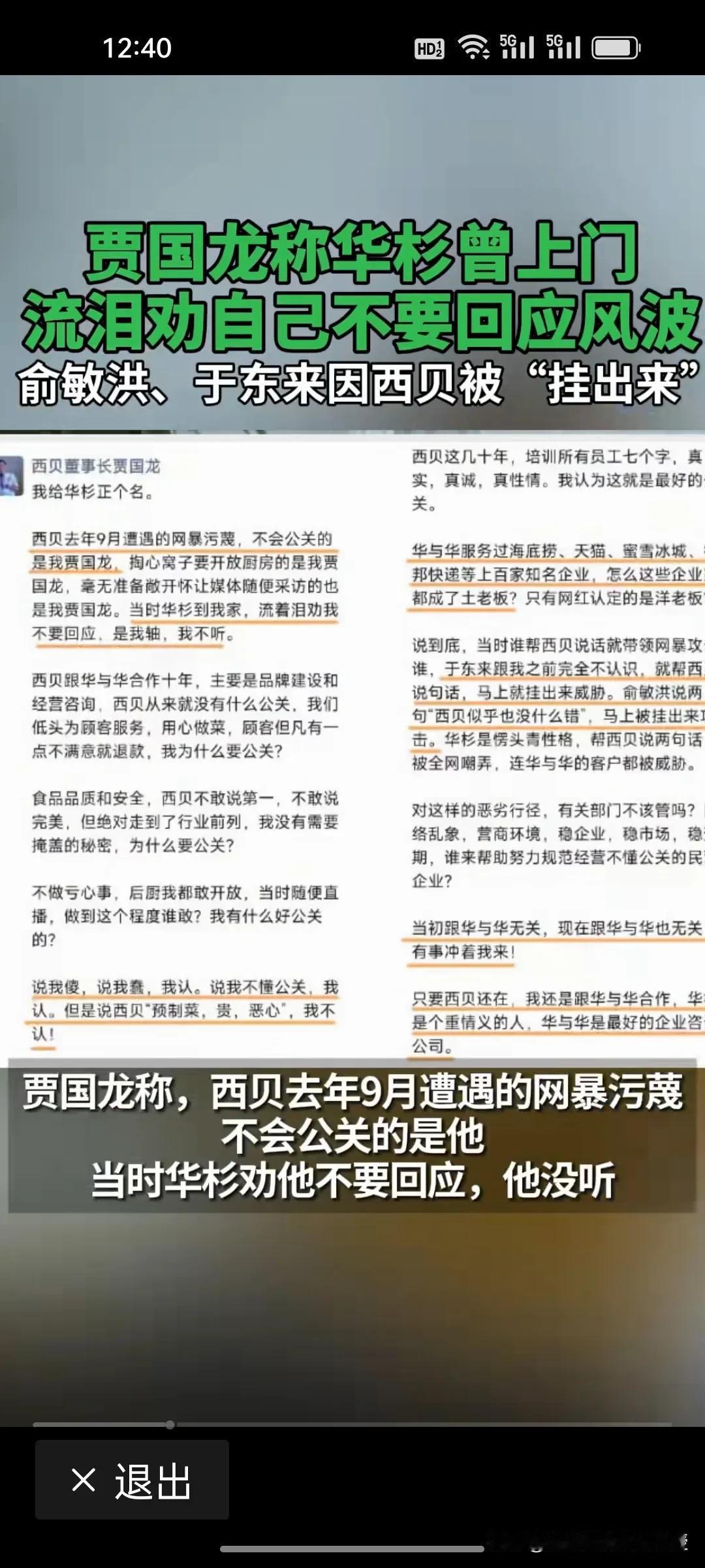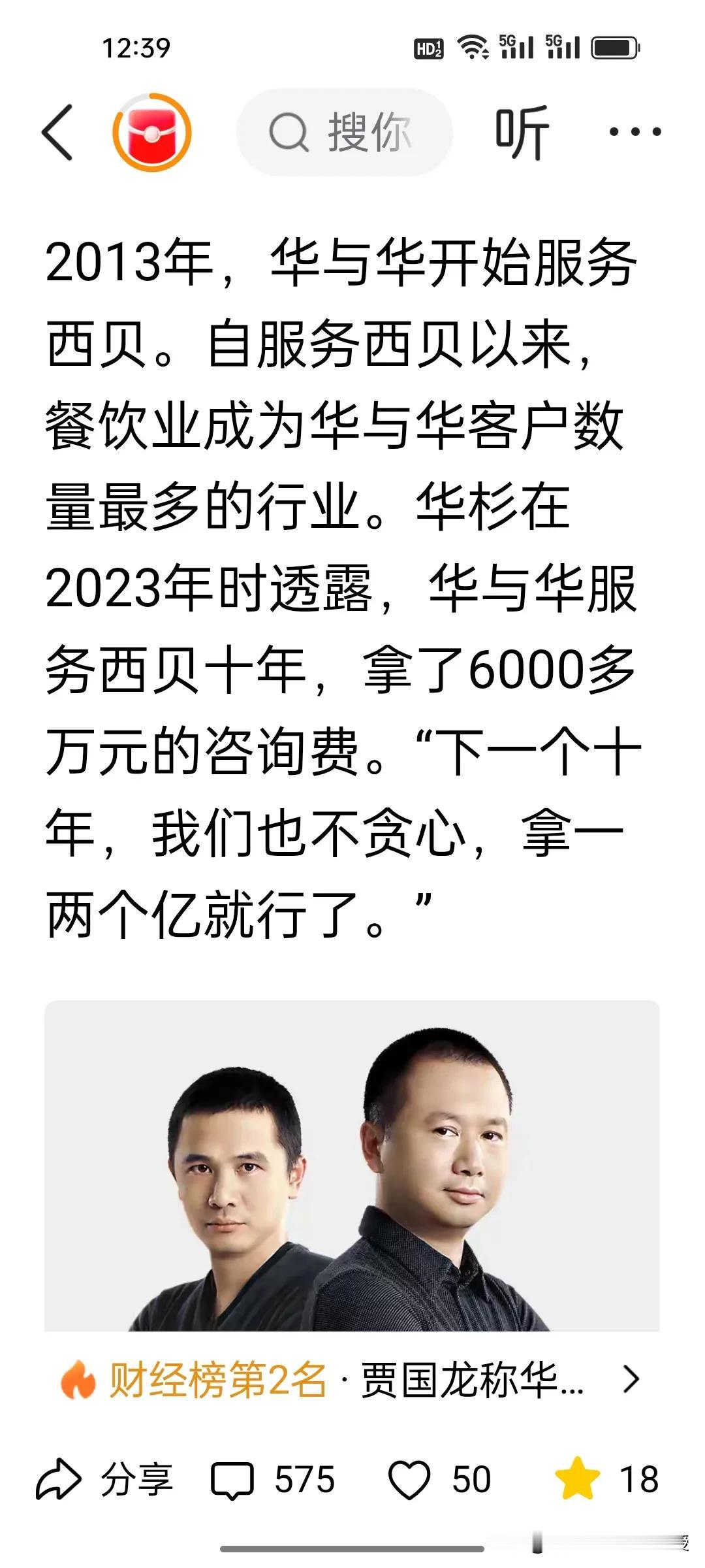 贾国龙为什么力挺华与华?面对西贝关店102家,贾国龙发朋友圈长文证实,全文满是不甘心,有愤怒,没有点名道姓罗永浩,却力挺华与华! 本来大家都已经快忘记西贝预制菜,贾国龙昨天一条朋友圈炸翻商界!直言“不懂公关是我的事,与华与华无关”,力证十年合作伙伴清白。要知道当初风波正劲时,华杉曾流泪劝他别回应,如今却遭内涵“服务土老板”,贾国龙直接硬刚到底,更是表态要继续合作华与华,他这么做也是给华与华的客户一点信心吧,不然华与华真没客户了。 罗永浩目前就贾国龙发朋友圈一事还没有回应,也至今没有公开华杉的录音。不过贾国龙出面力挺华与华,更多的是出于江湖义气。在流量至上、树倒猢狲散的商界,他不甩锅、不避嫌,把责任扛在自己肩上,华杉又该感动流泪了吧?