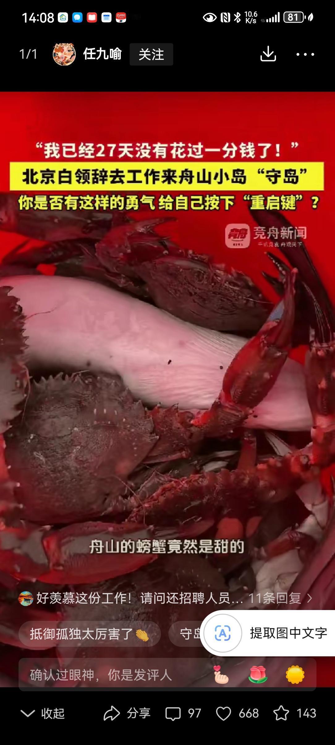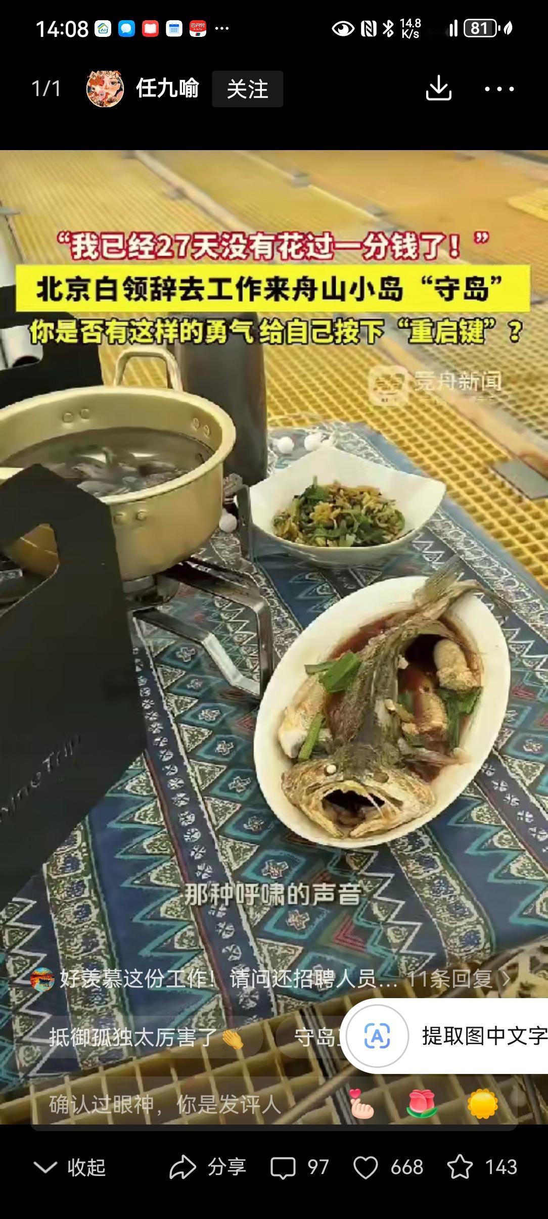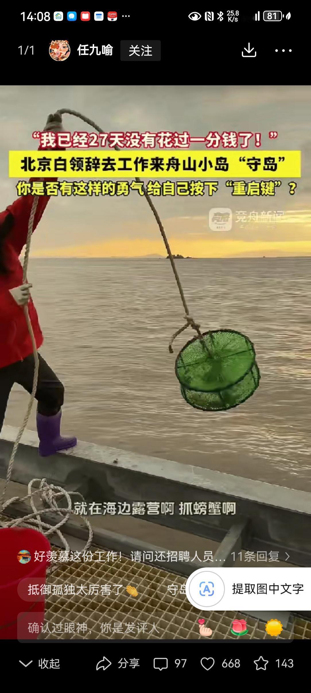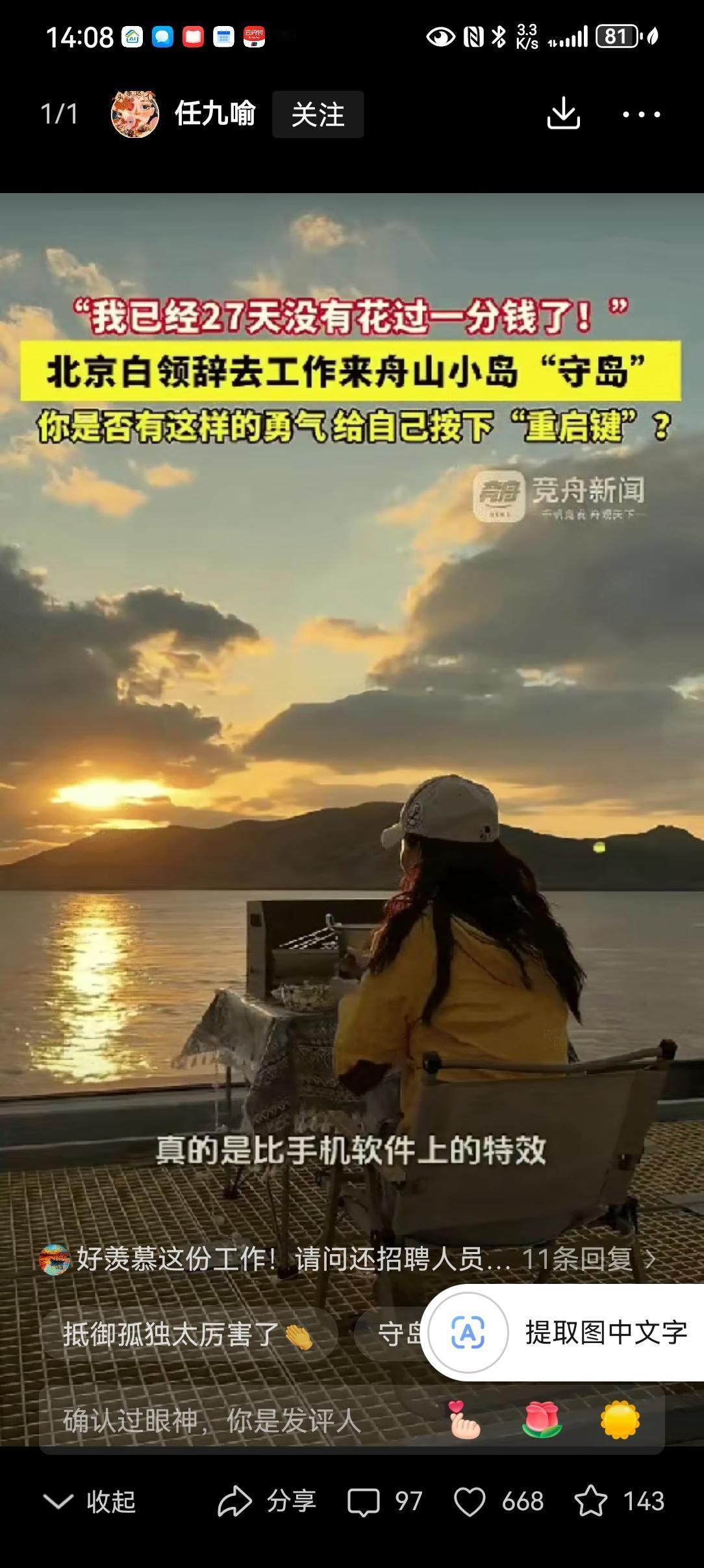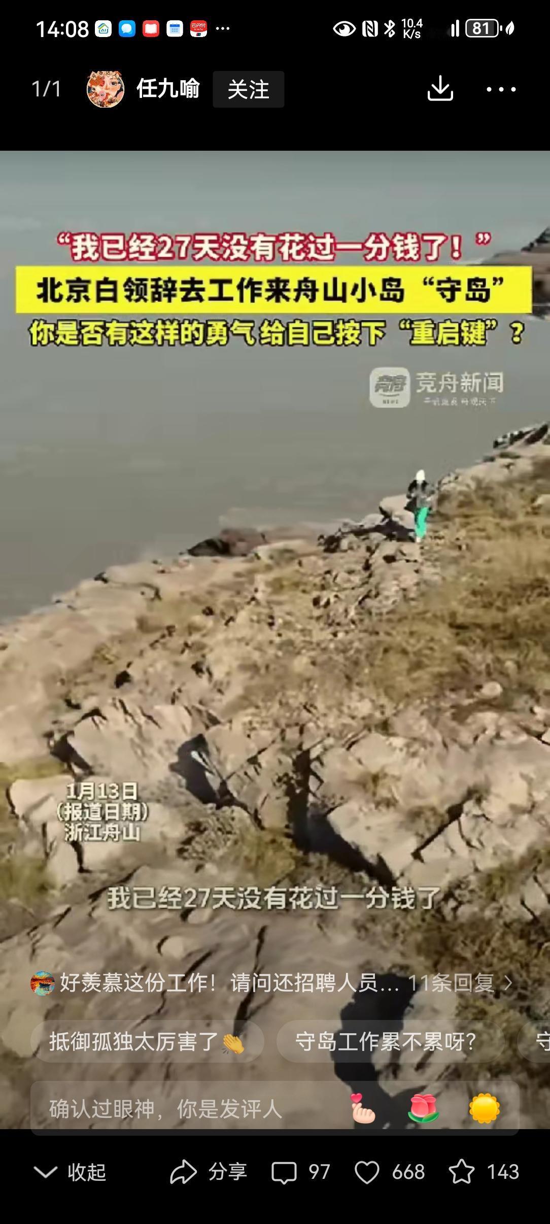 羡慕了!北京,一女白领去舟山旅游,无意间看到一则守岛招聘启事,二话不说就辞掉高薪工作去了,没想到的是,27天过去了她一分钱都没花,把无数人向往的诗和远方过成了日常。 这位女白领在房地产行当摸爬滚打多年,熬夜改方案是家常便饭,业绩的鞭子抽得人不敢喘气。城里的霓虹再亮,照不进心里的空落。 去年深秋去舟山散心,踩着沙滩时,海风裹着鱼腥味扑过来,倒比咖啡更提神。转角瞥见东寨岛渔场的招聘启事,心里那点念想突然就发了芽。 没跟家人多商量,辞呈一递,打包行李就上了岛。有人说她疯了,放着年薪几十万的工作不做,去守一座“孤岛”。 守岛的活不复杂,和工友们巡检养殖网箱,记记水温水压,看大黄鱼在水里摆尾。累是不累,却要耐住性子。 闲下来就扛着鱼竿去礁石上坐会儿,钓上来的海蟹、鲷鱼,清水一蒸,鲜味儿能钻到骨头里。岛上没有商场外卖,补给船半月来一次,生活用品够吃够用,倒省了花钱的念想。 二十七天下来,钱包分文未动,倒攒下满肚子海风的味道。只是冬夜的浪涛声能灌进枕头,9级大风刮得窗户呜呜响,手机信号时断时续,孤独像潮水般涨落。 她倒想得开:城里的内卷是钝刀子割肉,这里的孤独是明明白白的考验。日薪三百,包吃包住,攒钱比城里容易得多。 有人羡慕诗和远方,有人佩服破釜沉舟的勇气。其实生活哪有标准答案?能挣脱牢笼,选一条自己愿意走的路,就已是难得的清醒。