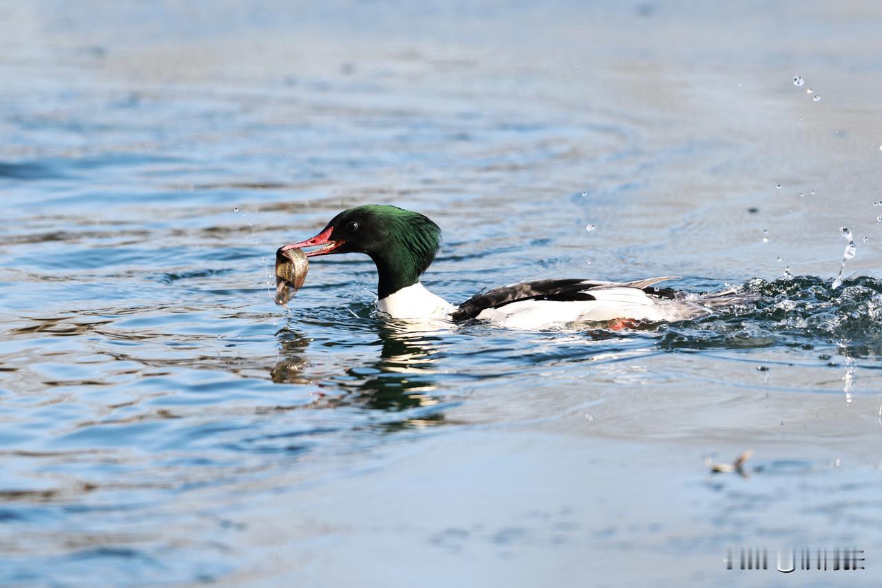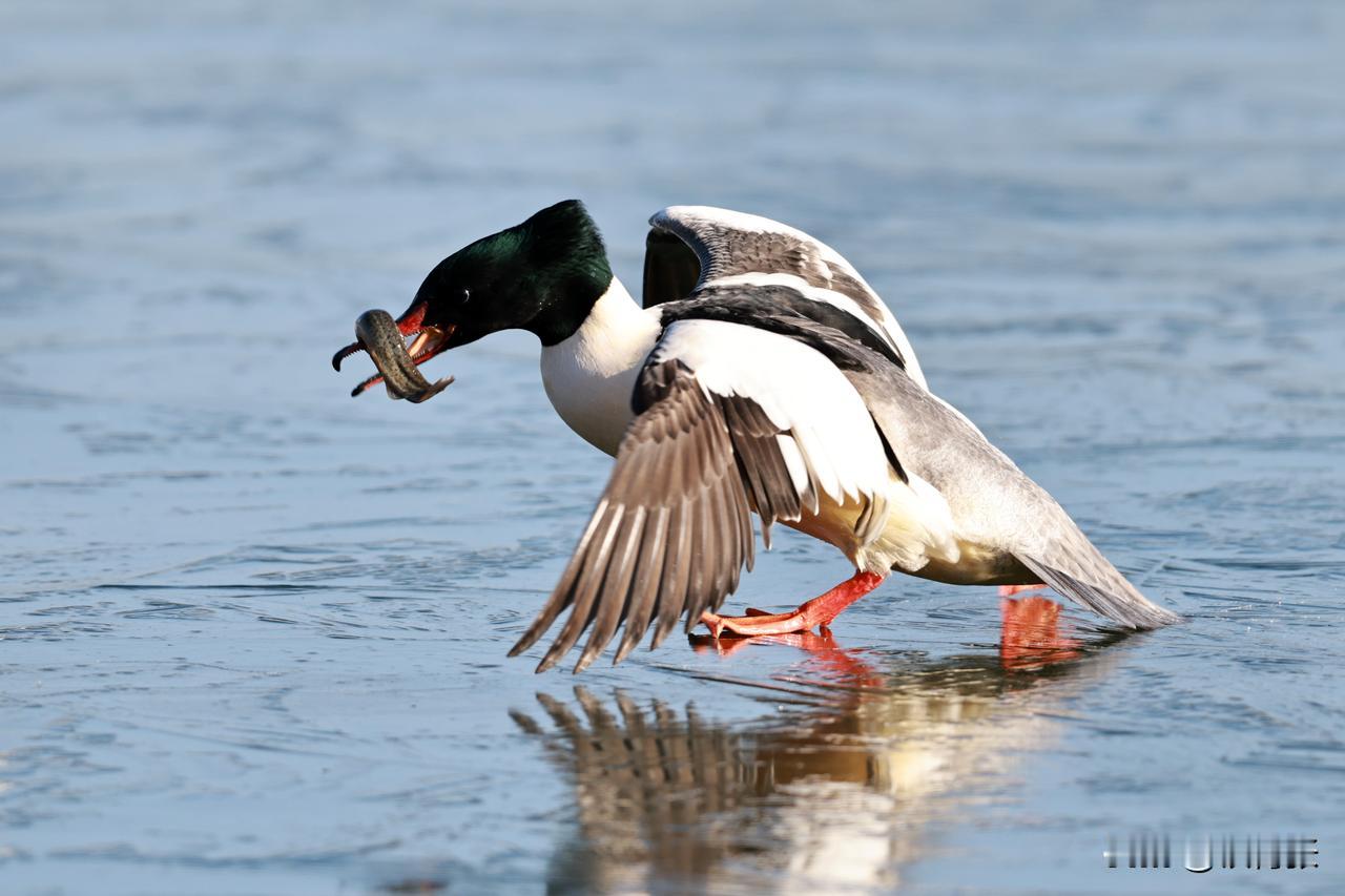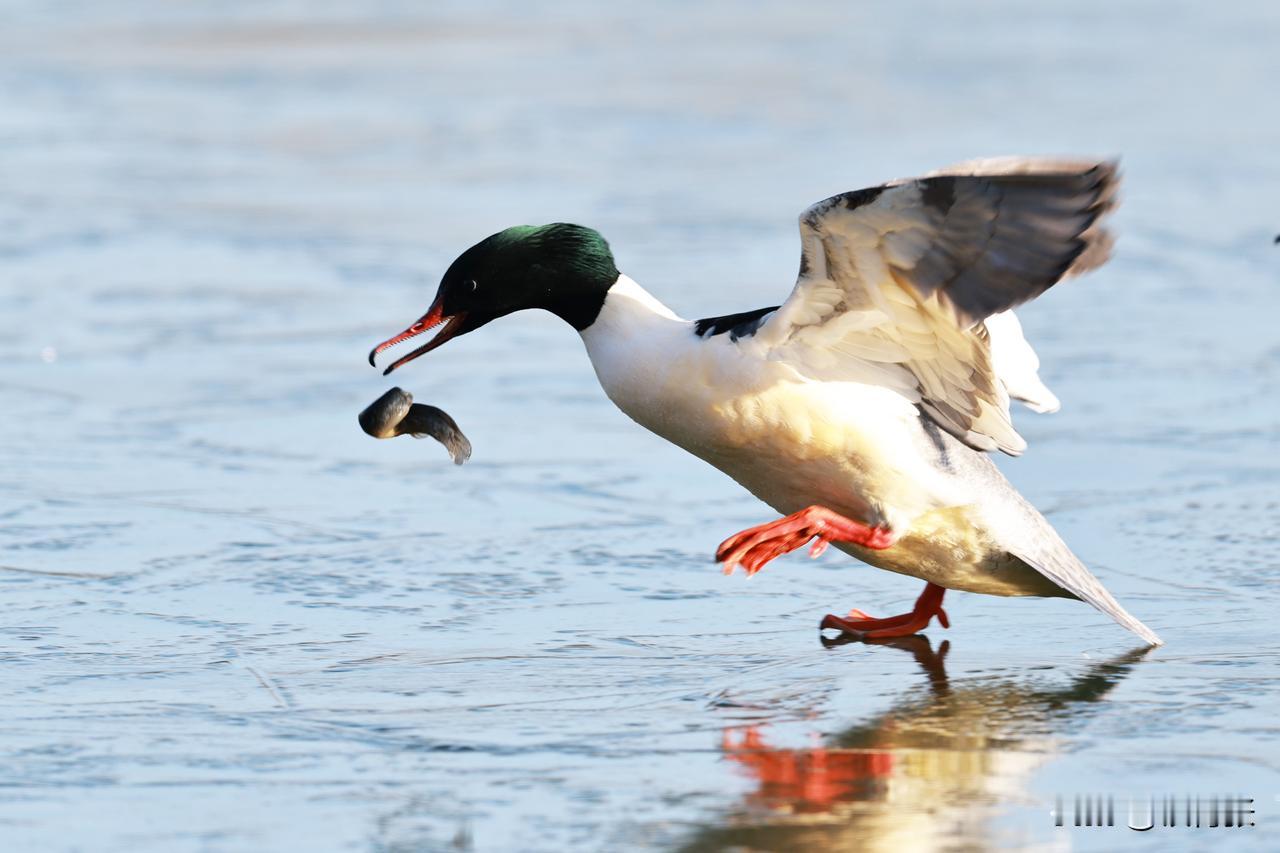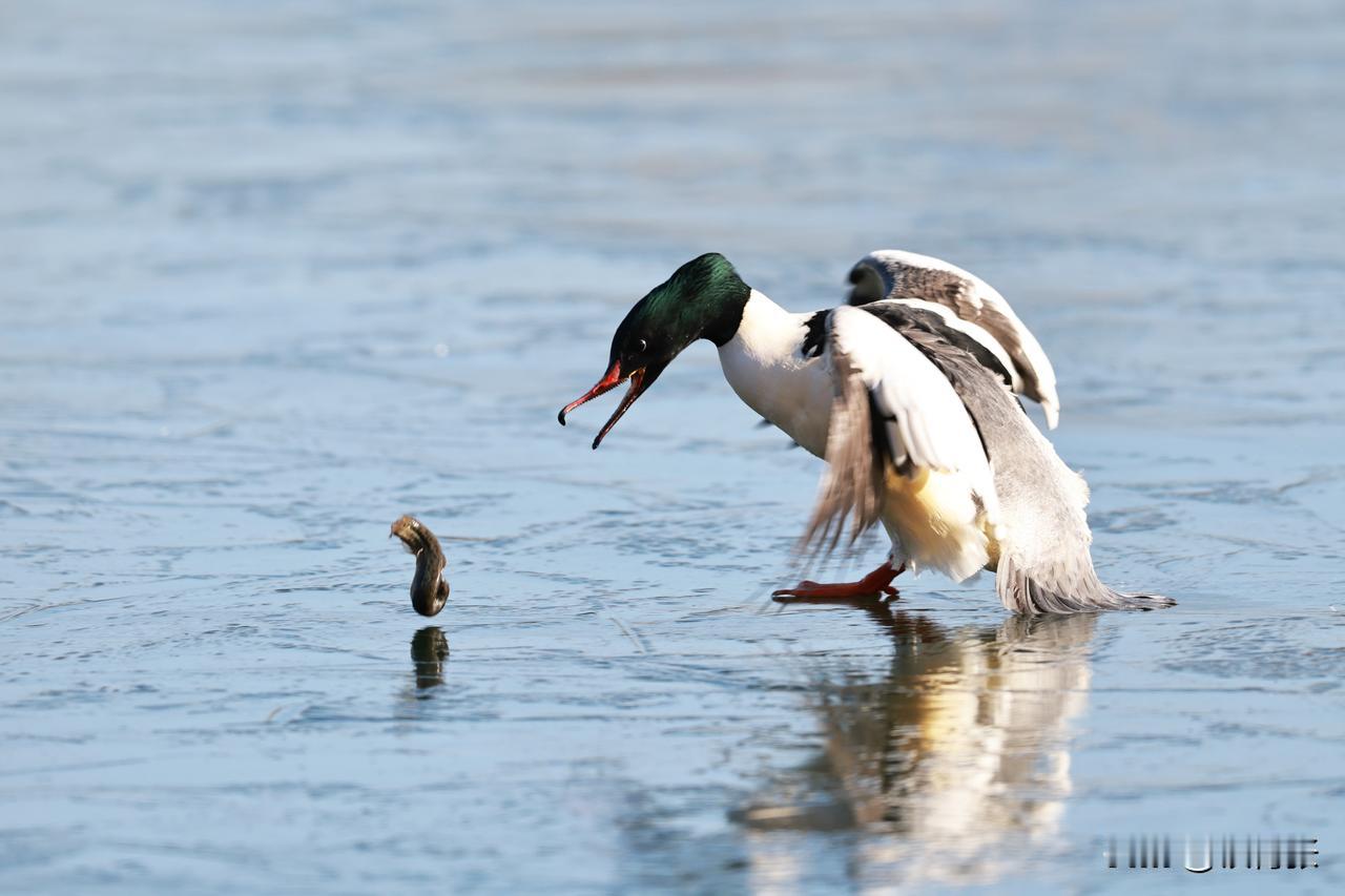 一只秋沙鸭在跑动过程中,泥鳅掉落,又失而复得。