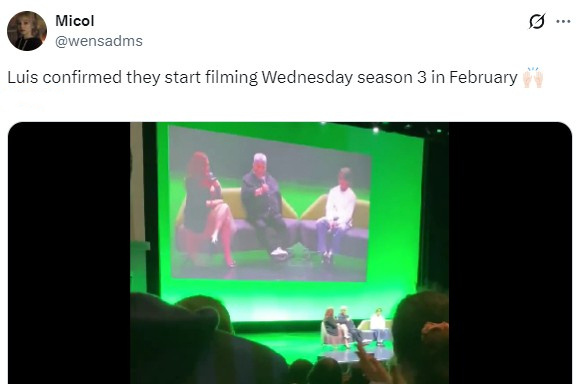 星期三第三季终于要启动了:最新消息S3将在今年2月开拍(绿娃已官宣加盟) 《星期三》第三季将主要在爱尔兰的都柏林和威克洛拍摄,根据当地影视制作网站的最新消息,本剧将于2月16日正式开拍,5月底结束主体拍摄。在剧中饰演“戈麦斯·亚当斯”的路易斯·古兹曼,近期在粉丝活动中也透露了这一消息。剧组此前已官宣伊娃·格林加盟S3,饰演星期三的阿姨奥菲利亚,“我们将见到更多亚当斯一家的成员,知道更多家族的秘密。” [火枪手三人组]中的“小狼女”艾玛·迈尔斯、“隐形妹”艾维·坦普尔顿及其他主演也将同步回归 .跨年电影愿 星期三第三季开拍
