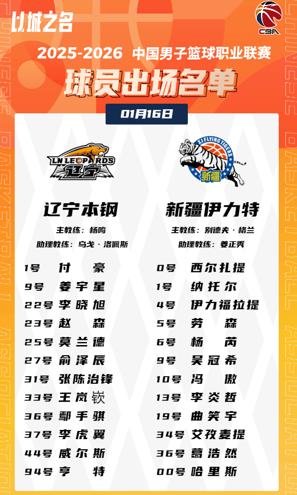 今日CBA常规赛,辽宁对阵新疆的大名单已经出炉。