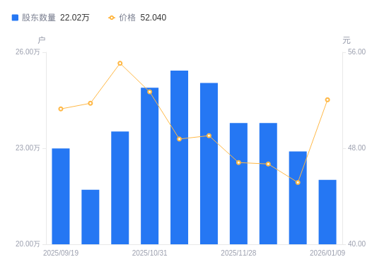 日期A股户数(户)流通A股户均持股数(股)户均持股市值(万元)2026-01-092201514820.4225.092025-12-192289984634.1920.922025-12-102379034460.7320.832025-11-282378784461.2020.882025-11-202503934238.2220.792025-11-102542424174.0620.362025-10-312489274263.1822.472025-10-202352324511.3824.852025-09-302170594889.0925.302025-09-192299634614.7523.66
