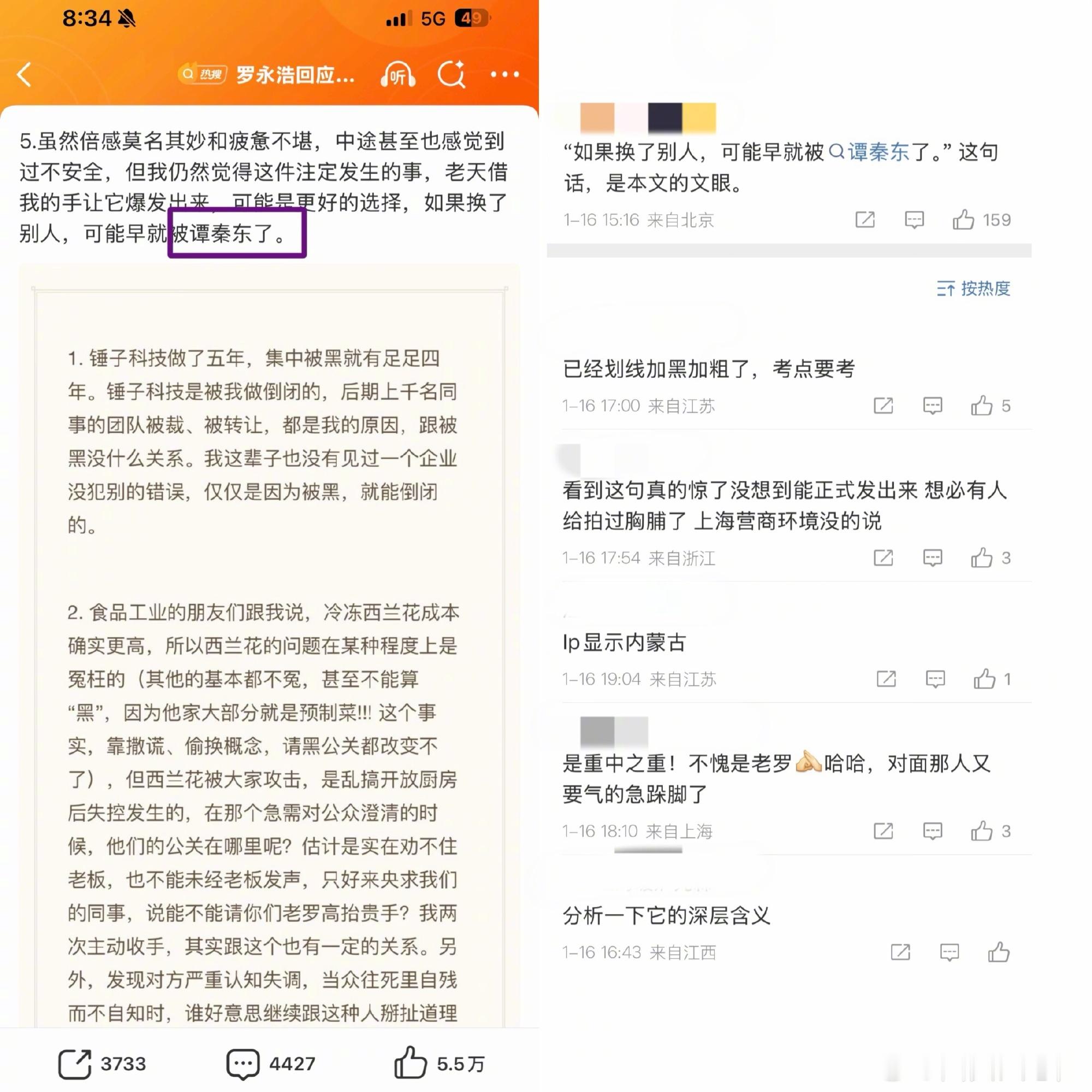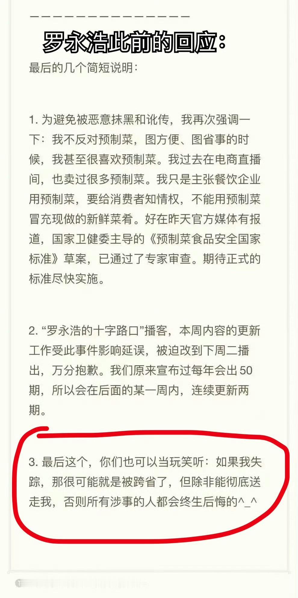 1月16日晚,贾国龙曾通过公司账号 西贝人心声 补充声明称,去年罗永浩制造的网暴期间,全国西贝门店服务员被骂被打被逼下跪数十次。还表示家人遭人肉搜索(包括5岁孙女信息泄露),仅妻子因安全担忧报警一次。最后喊话罗永浩,称这件事你必须给我说清楚。你心虚是你的事,明天请你跟我一起去内蒙古自治区政府,去内蒙古公安厅,去公安部也行,查明我贾国龙有没有报警或找关系抓过你,如果有,我贾国龙随你处置。如果没有,请你向全国网民道歉,向公安部门道歉。目前该账号主页的这篇回应已看不到。西贝回应罗永浩 贾国龙