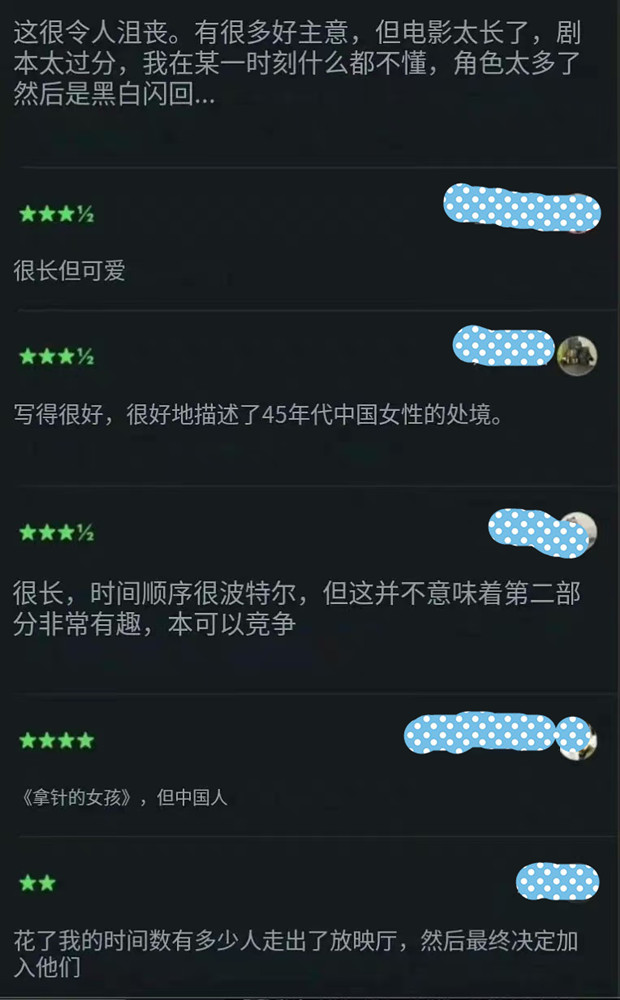 150分钟影片太长,出场人物太多,台词不够深刻像喊口号,中途陆续有观众看不下去离场。