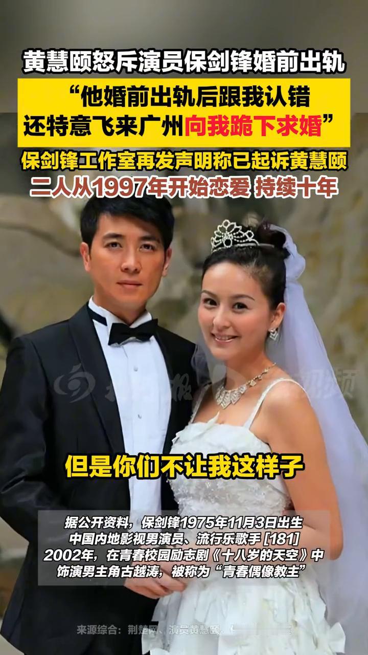 黄慧颐怒斥演员保剑锋婚前出轨,保剑锋工作室称已起诉黄慧颐。 荆楚网。 1月14日,57岁演员黄慧颐再晒与保剑锋旧照并发文称:"我们在2001年8月28日登记结婚,保剑锋曾在2001年春节的时候婚前出轨,并且曾在电话里承认自己出轨"。 随后,保剑锋工作室再发声明称已委托律师就黄女士网络侵权言论提起民事诉讼,立案资料也已由律师提交法院。 此前,黄慧颐在直播中透露与演员保剑锋从1997年开始恋爱,持续了十年,强调两人在2007年分手,但保剑锋在2006年就将家中的女士香水送给了某女士。 据公开资料,保剑锋1975年11月3日出生,中国内地影视男演员、流行乐歌手[181]。2002年,在青春校园励志剧《十八岁的天空》中饰演男主角古越涛,被称为"青春偶像教主"。 编辑:吴姝霖。