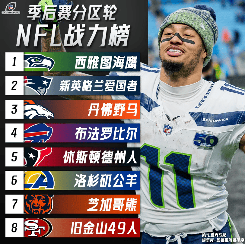 虎扑01月17日讯NFL官方更新季后赛分区轮战力榜排名,西雅图海鹰、新英格兰爱国者、丹佛野马排名前三,以下为完整榜单: