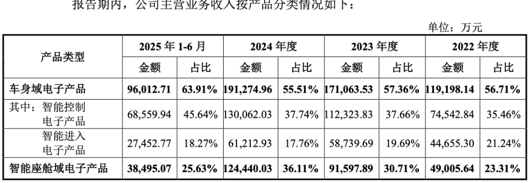 它主要制造四大类“大脑”:车身域电子产品是它的王牌和现金牛,像个“车辆大总管”,管理车门、车灯、车窗等基础功能。它占据了公司过半的营收,2022年-2024年、2025年1-6月(下称“报告期”),该部分销售金额分别为11.92亿元、17.11亿元、19.13亿元和9.6亿元,营收占比常年超过55%。