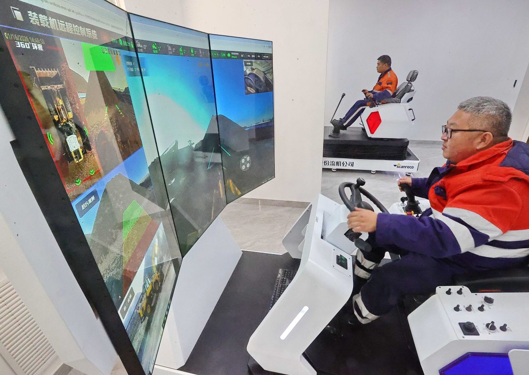 1月16日,河北省秦皇岛市秦皇岛港股份有限公司流机分公司机械六部,工作人员远程操控装载机开展场地清理和堆高作业。