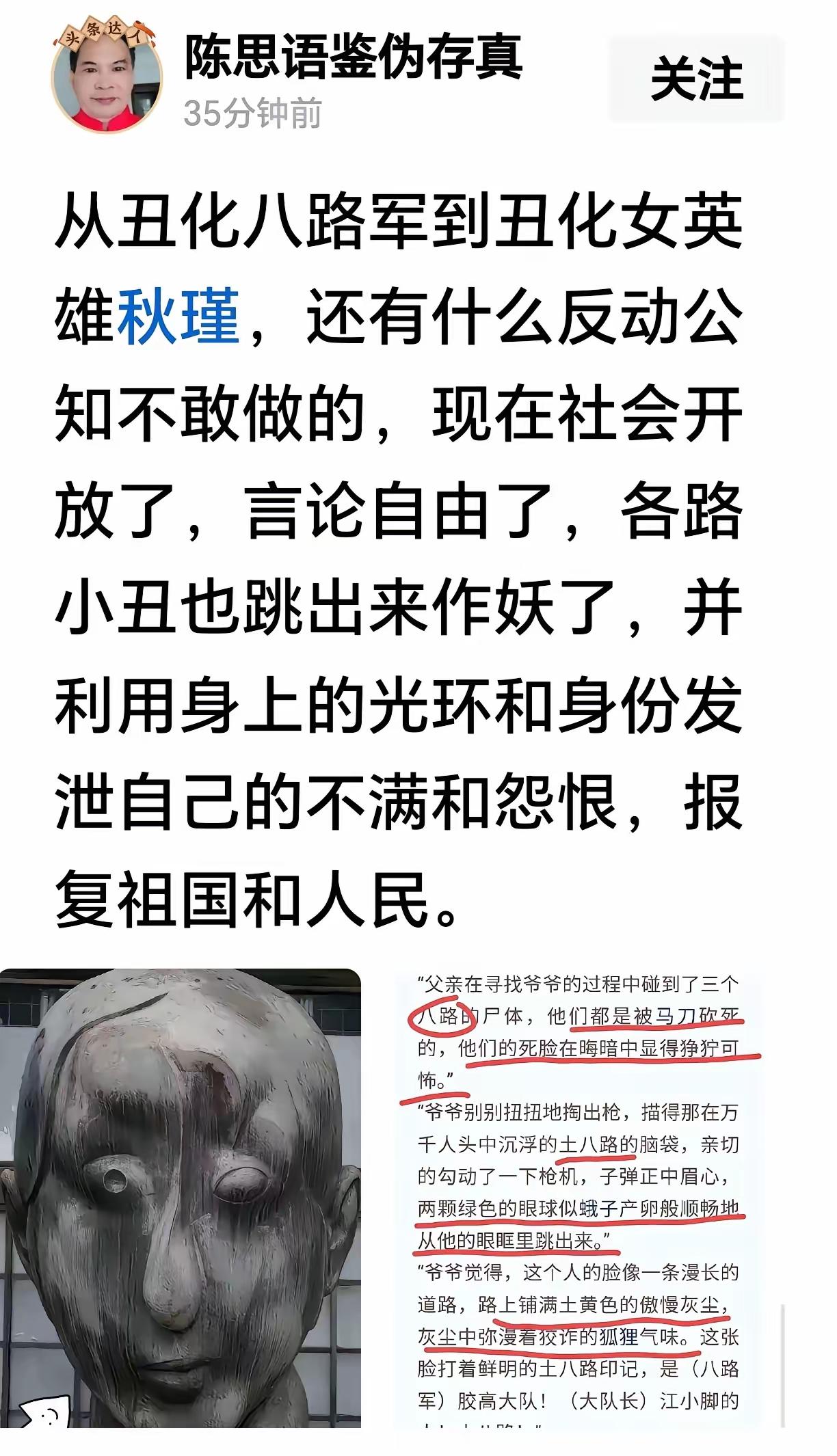 该出手了!公知诋毁英烈的歪风,绝不能再纵容! 刷到某公知抹黑英烈的言论,气得我血压飙升!这些人打着“言论自由”的幌子,肆意诋毁伟人、抹黑英雄,把历史当成任人打扮的小姑娘,良心不会痛吗? 本该守护意识形态阵地的宣传部门,有时却显得有些“手软”。面对这些跳梁小丑的猖狂言行,不痛不痒的批评根本没用,他们只会变本加厉。要知道,伟人是民族的精神灯塔,英烈是家国的脊梁,容不得半点亵渎! 但转折正在发生:越来越多网友自发反击,举报不良言论;官方也开始亮剑,对违法者依法严惩。宣传部门更该主动出击,扛起监督大旗——对违反原则的公知言行零容忍,对恶意诋毁的作品严肃查处,对触碰法律红线的绝不姑息! 意识形态阵地,我们不去占领,敌人就会钻空子。守护英雄、捍卫历史,不是一句空话,而是每个中国人的责任。只有重拳出击,才能刹住这股歪风,还思想领域一片清朗! 你支持对诋毁英烈的行为严惩不贷吗?评论区说说你的看法!
