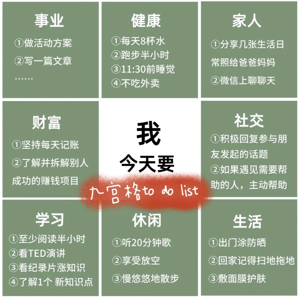 4️⃣每天晚上临睡前花10分钟写一个第二天的to do list(可参考“时间管理九宫格”),事项不要太满。