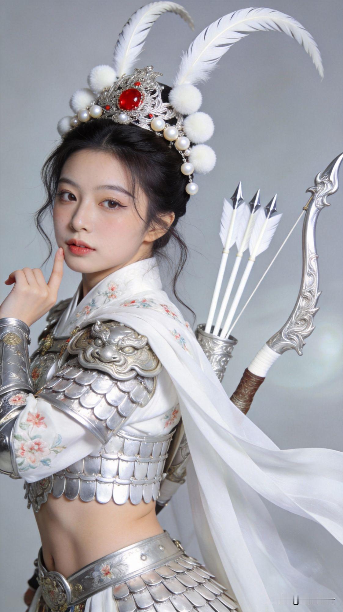 霓裳战影,梦萦佳人 在时光长河的幽谧转角,她宛如一抹皎洁月光,自历史画卷中翩然而至。 那束发银冠,似夜空中闪烁的星辰,镶嵌的红色宝石如炽热火焰,点燃了岁月的寂静;多颗珍珠圆润晶莹,散发着柔和的光晕,与白色绒球相互映衬,尽显华贵;两根长长的白色鸟羽,似戏曲武生般潇洒不羁,向后弯曲的姿态,仿佛在诉说着往昔的英勇传奇。 她身着白色蜀锦百花袍,每一针每一线都绣满了春日的繁花似锦,似是将整个春天都穿在了身上。外罩的汉代形制铠甲,肩吞兽威风凛凛,环臂甲、胸甲、裙甲、捍腰,层层叠叠的银白色金属札甲甲片,在阳光下闪烁着冷冽的光芒,却又勾勒出她曲线玲珑的身姿,刚柔并济,美得动人心魄。 白色长披风随风猎猎飘扬,似是她在天地间自由驰骋的羽翼,带着她穿越时空的迷雾,来到这繁华尘世。她背负的银白色金属宝雕弓,宛如弯月,散发着神秘而强大的气息;白羽白杆狼牙箭,整齐排列,似是她守护正义的利刃。 她微微侧首,俏皮的动作中透着慵懒气息,柳叶眉轻挑,丹凤眼含情,眉目间流转着清秀娇嫩的光彩。精致可爱的妆容,衬得她肌肤白皙紧致,纹理细腻如丝,在自然光线的轻抚下,泛着柔和的光泽,宛如温润的玉石,纯净而无暇。 鬓角的发丝凌乱自然垂落,为她增添了几分随性洒脱。她就那样静静地站在那里,仿佛与这世间的一切都融为一体,又似超脱于尘世之外,成为了一道永恒的风景,让人沉醉,让人痴迷,久久不愿醒来。彩韵霓裳 粉纱洛神影 丝路战裳录 古风战影 花漾霓裳 霓裳之梦 燕影霓裳