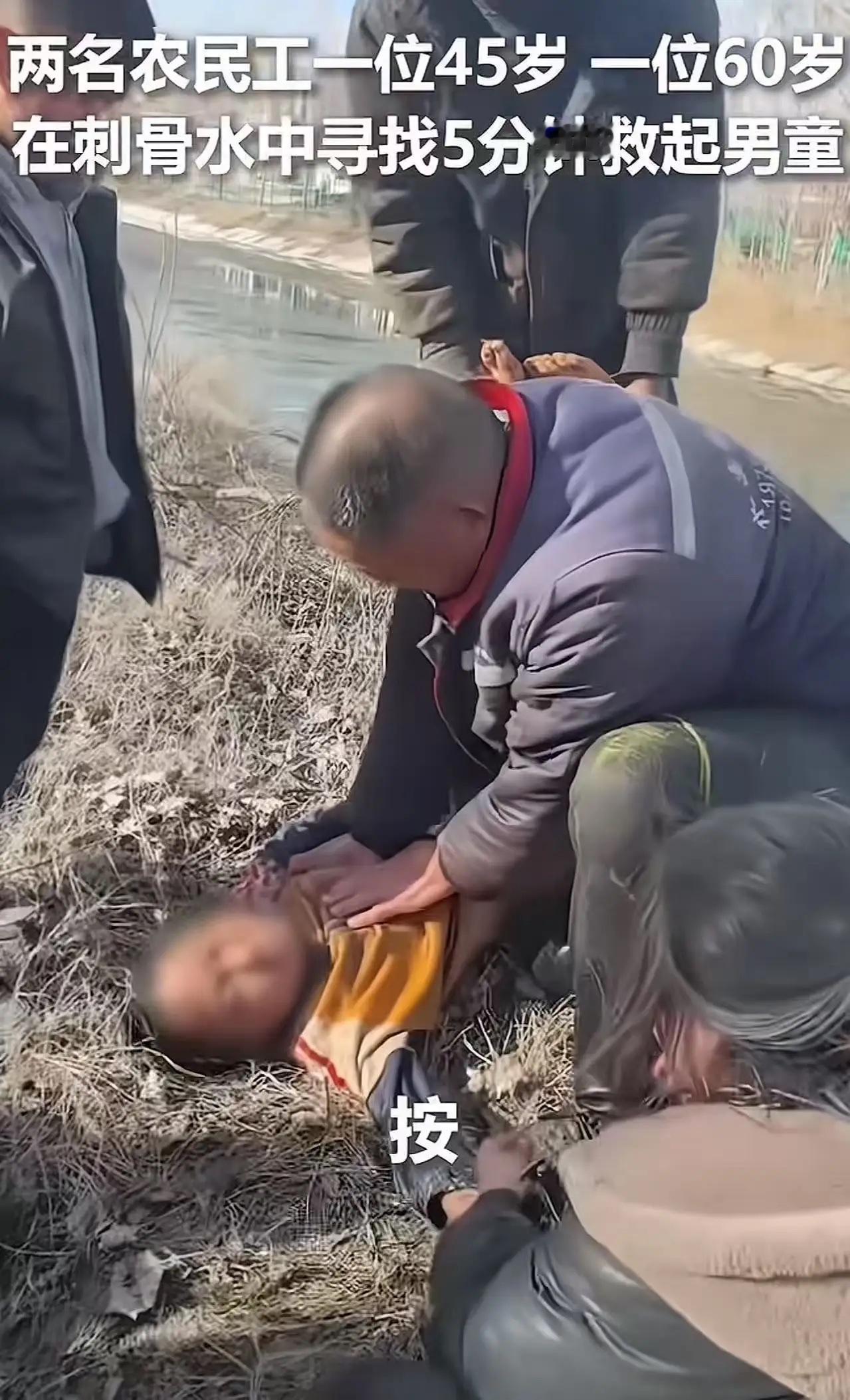 2026年1月11日下午河南兰考,9岁男童不慎落水,同行的妹妹立即跑到附近的水泥厂求救,两名农民工毫不犹豫地跳入冰冷的河水,在河里捞了5分钟,终于发现了男孩。可男孩被抱上岸时,已经没了呼吸,妹妹见状哭的更伤心了……但奇迹却出现了! 当天午后的兰考,气温只有六七度,寒风裹着枯草在河岸盘旋。 9岁的男童跟着妹妹在河边玩耍,脚下的冻土突然松动,他整个人重心失衡,“扑通”一声坠入冰冷的河水中。 湍急的河水瞬间将他卷向深处,浑浊的水面很快没了男孩的身影。 年仅7岁的妹妹吓得浑身发抖,眼泪糊满了小脸,她知道附近只有一家水泥厂有人,便转身朝着工厂的方向狂奔,单薄的身影在寒风中摇摇欲坠。 “有人落水了!快救救我哥哥!”小女孩带着哭腔的呼喊刺破了水泥厂的宁静。 正在车间里忙活的62岁农民工龙相臣和45岁的工友代艳合,听到呼救声后立刻扔下手中的工具,跟着小女孩往河边跑。 跑到岸边一看,河面平静得吓人,根本看不到男孩的踪迹,只有冰冷的河水泛着寒气。 龙相臣心里一紧,来不及多想,连身上的棉衣都没脱,就纵身跳进了河里。 河水瞬间漫过胸口,刺骨的寒意顺着衣领钻进身体,冻得他牙齿打颤,手脚很快就有些僵硬。 代艳合紧随其后也跳了下去,两人在浑浊的河水中摸索着前行。 河底长满了茂密的水草,像无数只手缠绕着他们的腿脚,每走一步都异常艰难。 他们只能凭着感觉在水中试探,用手和找来的小木棍一点点排查,生怕错过任何蛛丝马迹。 时间一秒一秒地流逝,岸边小女孩的哭声越来越绝望,两位农民工的额头却渗出了汗珠,混着河水顺着脸颊滑落。 五分钟后,龙相臣的木棍突然触到了柔软的布料,他心里一喜,赶紧顺着布料摸过去,果然抓住了男孩的胳膊。 两人合力拨开缠绕的水草,小心翼翼地将男孩托出水面,奋力向岸边游去。 当男孩被抱上岸时,小脸已经青紫发紫,嘴唇毫无血色,躺在地上一动不动,连呼吸都摸不到了。 妹妹扑到哥哥身边,双手紧紧抓着他的衣角,哭声愈发悲痛,几乎要背过气去。 龙相臣顾不上自己浑身湿透、冻得发抖,立刻跪在冻硬的地面上,解开男孩的衣领开始做心肺复苏。 代艳合在一旁帮忙拨打120,同时不停地揉搓男孩的四肢,试图让他恢复体温。 龙相臣粗糙的手掌带着力量,一下一下按压在男孩的胸口,每一次按压都用尽了全身力气。 寒风呼啸着刮过,他的双手冻得不停颤抖,棉衣上的冰水顺着衣角往下滴,在地面结成薄薄的冰碴。 旁边水泥厂的老板娘也赶了过来,在一旁指导着急救的动作,围观的村民们都屏住了呼吸,目光紧紧盯着男孩,没人敢出声打扰。 就这样坚持了十余分钟,就在大家以为希望渺茫的时候,男孩突然“哇”地一声吐出了好几口河水,嘴唇微微颤动了一下,接着缓缓睁开了眼睛。 “活了!孩子活了!”代艳合激动地喊了出来,围观的人群瞬间爆发出欢呼声,小女孩也停止了哭泣,哽咽着喊着“哥哥”。 龙相臣长舒一口气,瘫坐在地上,冻得发紫的脸上露出了疲惫却欣慰的笑容。 不久后,120救护车赶到现场,将男孩送往医院检查。 医生说孩子只是胃里进了点水,受凉后有些不适,观察一段时间就无大碍。 水泥厂老板代先生特意给龙相臣和代艳合放了假,工资照发,还打算给龙相臣换一部新手机——他救人时揣在口袋里的手机,已经被河水泡坏了。 男孩的父母从外地赶回来后,握着两位救人者的手泣不成声,反复说着感谢的话。 目前,当地村委会已经向上级部门汇报,正在为两人申报见义勇为称号。 寒风依旧凛冽,但这场跨越生死的救援,却让这个冬日的兰考变得格外温暖。 两位普通的农民工,用毫不犹豫的纵身一跃和坚持不懈的心肺复苏,不仅救回了一个男孩的生命,更守护了一个家庭的完整。 信息来源:极目新闻