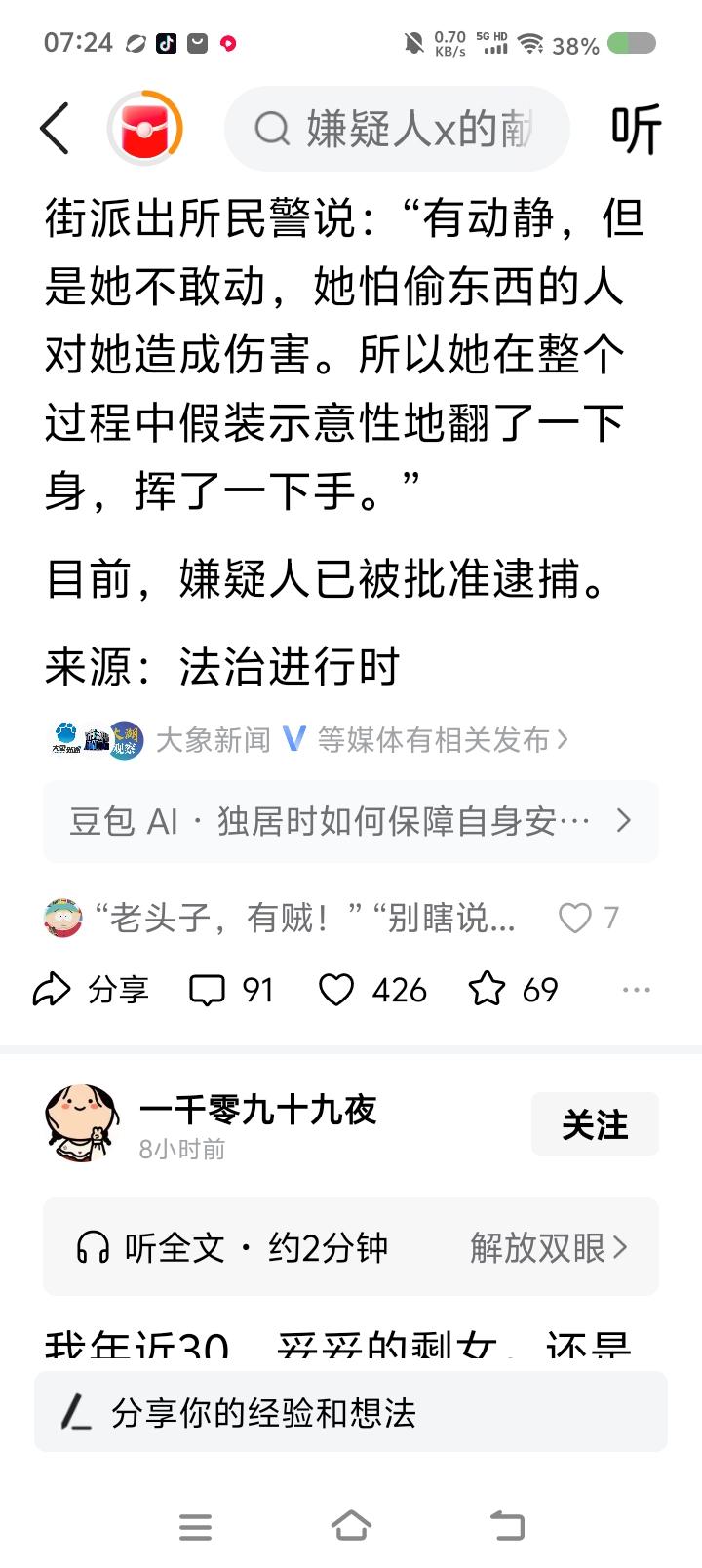 万一小偷爱学习呢?—— 据报道,一蒙面小偷进入一户人家,在床头翻东西。女主人为了避险,假装睡着,还翻了一下身。最终,小偷被捕。 点评: 一、评论区不少人回忆小偷入室盗窃甚至拿刀的经历。窃与劫,在有些人脑子里会快速转换。 二、如果此人爱学习,他从此事件悟出了什么?后果不堪设想。 因此,不要什么事都公布,不要给违法犯罪分子任何学习的机会。