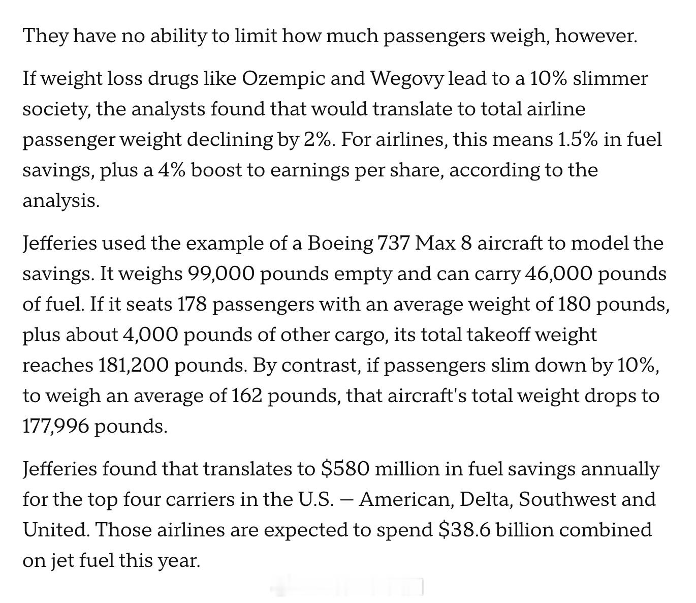 减肥神药GLP-1等药物的横空出世可为美国航空公司节省超过5.8亿美元的燃油开支:Jefferies Research Services分析称,如果乘客平均体重下降10%,航空公司乘客总重量将减少约2%,燃油消耗可降低1.5%,每股收益预计会提升4%。以波音737 Max8为例:飞机空重99000磅,可装载46000磅燃油,搭载178名平均体重180磅的乘客及4000磅货物,总起飞重量为181200磅。若乘客体重下降10%至162磅,总重量降至177996磅。Jefferies估算,这可为美国前四大航空公司美国航空、达美航空、西南航空和联合航空每年节省约5.8亿美元燃油开支。今年这四家航空公司燃料开支预计达386亿。今日热点海外新鲜事减肥神药