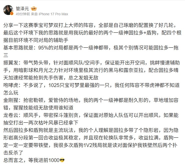 分享一下这赛季宝可梦双打上大师的阵容,全部是自己琢磨的配置换了好几轮,最后这个环境下我的思路就是用我玩的最好的两个一级神固拉多+盾狗,配四个根据目前环境不同对局的辅助手