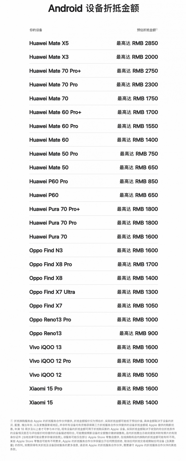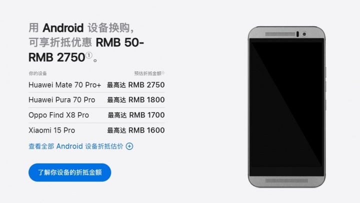苹果官网更新安卓机型折抵公示列表,新增2024-2025年热门旗舰机型,用户可直观查询对应设备价值,无需额外跳转或咨询。