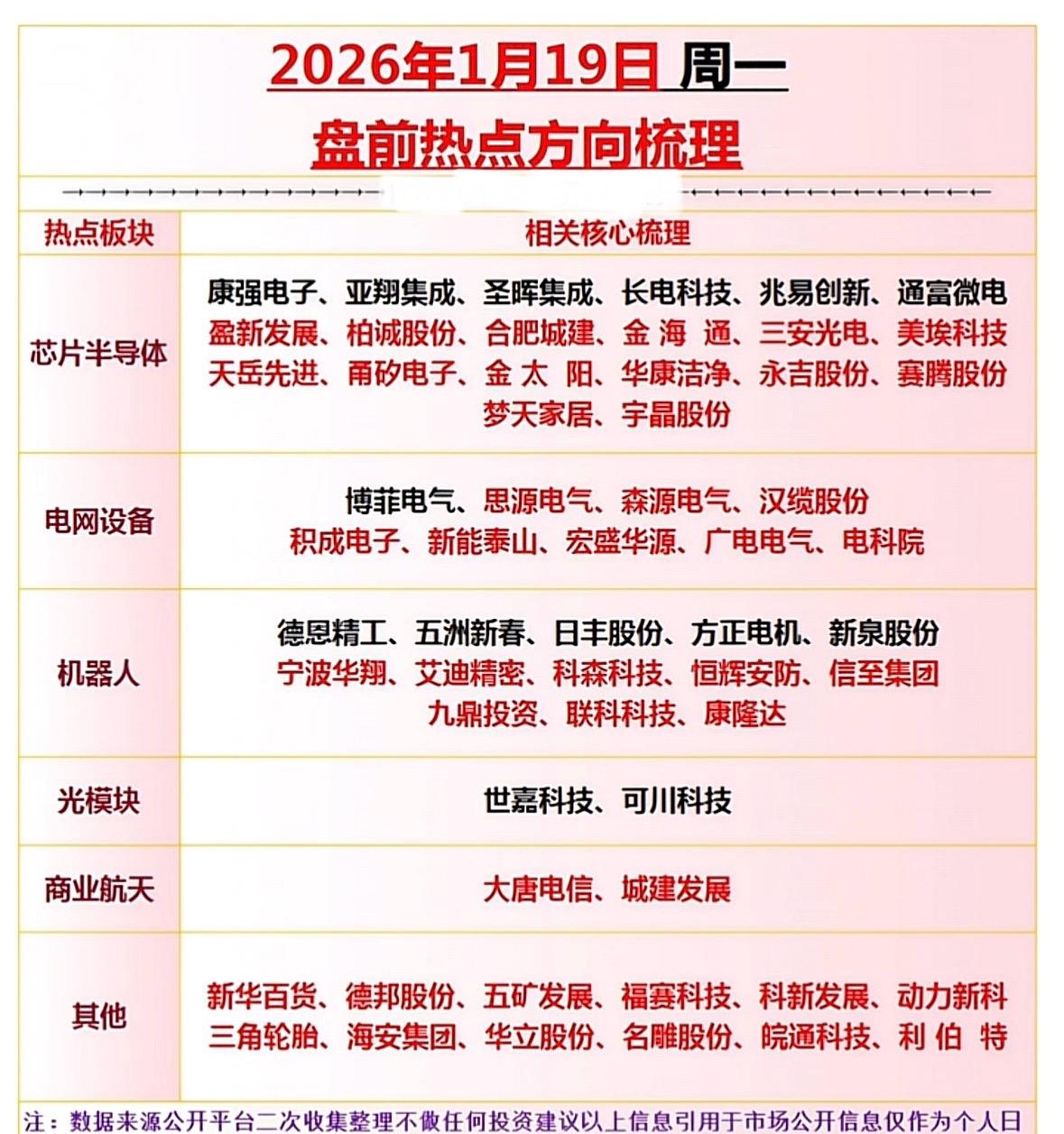 1月19日星期一盘前热点方向梳理 芯片半导体、电网设备、机器人等板块受关注,多只个股活跃,市场热点轮动加速 芯片半导体领涨,电网设备机器人活跃,商业航天光模块异动,多板块轮动布局需关注核心标的。