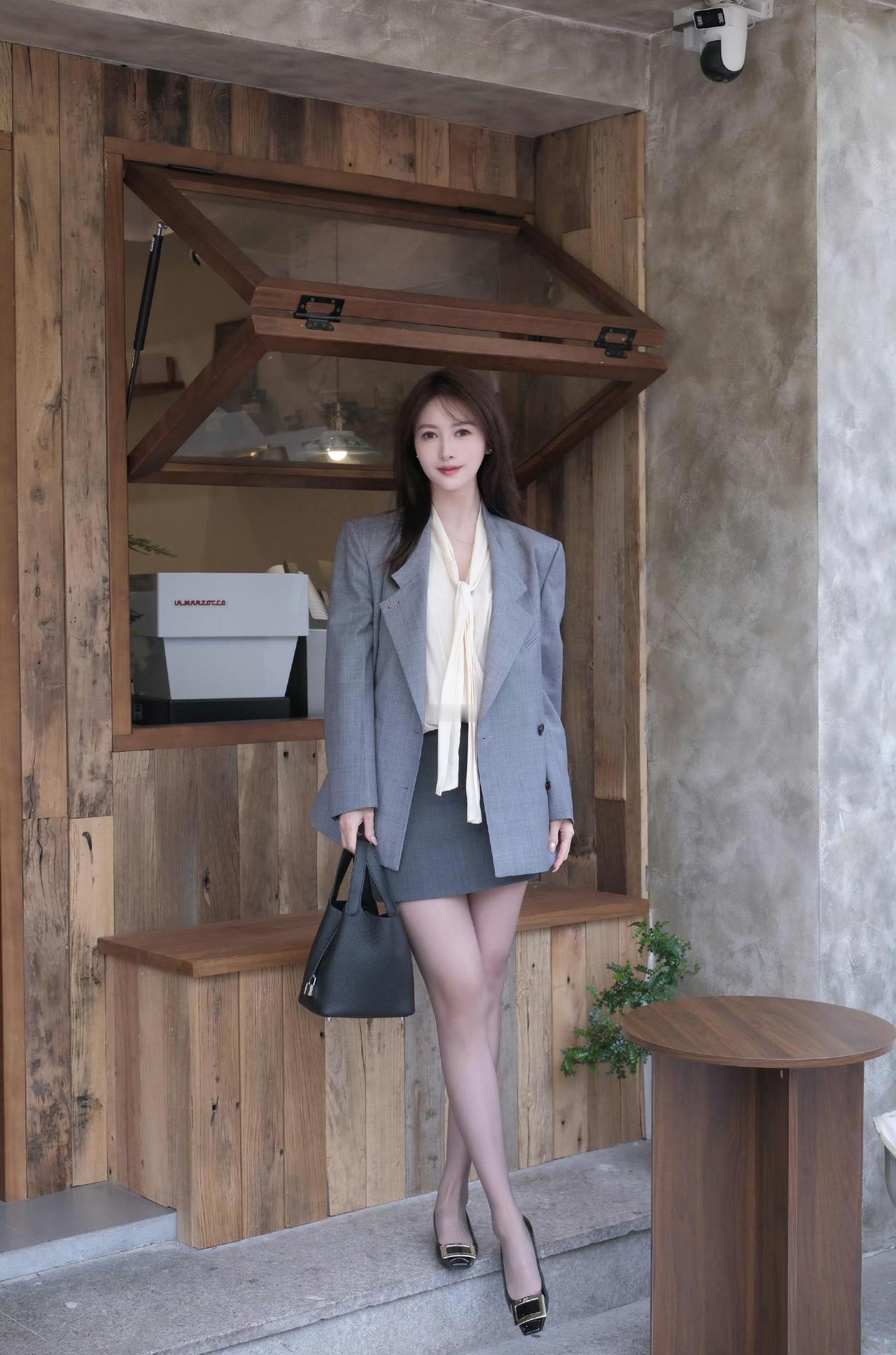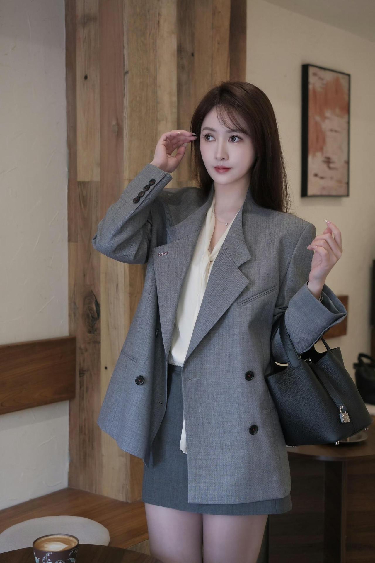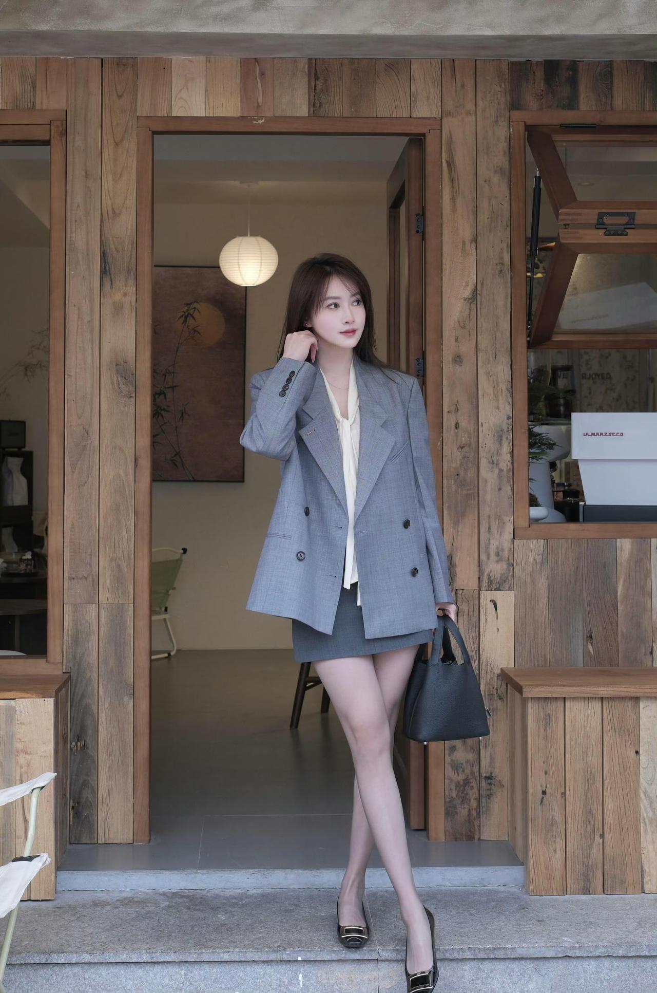 这套穿搭是干练优雅的灰调轻熟风,把职场利落感和温柔细节融合。灰色双排扣西装套装自带干练气场,宽松版型显松弛;内搭米白衬衫添柔和质感,短款裙型注轻熟感,适配文艺咖啡馆打卡、轻职场通勤等场合。 搭配金属扣高跟鞋强化轻熟精致感,黑色手提包提升实用轻奢感,和木质环境的氛围高度契合。充分展现穿着者干练优雅的轻熟魅力。灰色西装套装裙 灰色西装裙套装