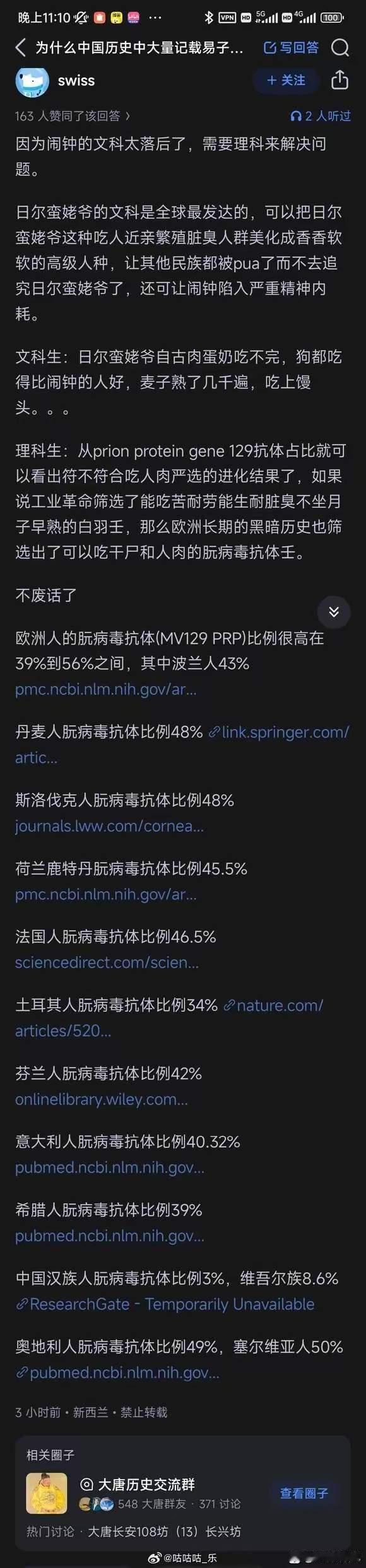 朊病毒抗体比例主要与人类历史上是否频繁接触朊病毒有关,一般认为其比例较高可能意味着该人群在历史上有过较多食人行为或接触同类尸体的情况,因为朊病毒可通过这种途径传播,使得相关抗体通过自然选择在人群中保留下来。 例如,汉族朊病毒抗体(129MV PRP)比例低至3%出头,东亚各世居民族普遍较低,日本最高也才6%,而欧洲各民族多在40%以上,太平洋岛屿民族最高可达50%以上。这只能说明不同地区人群在历史上接触朊病毒的程度可能不同,直接反映古代各民族食人习惯。人肉朊病毒 朊毒体 朊病毒抗体 都朊 朊粉 朊粒病 梦朊 精神测序 油养朊 毒蛋白基因 基因寡糖 感染kp 文朊油 病毒kp pe病毒