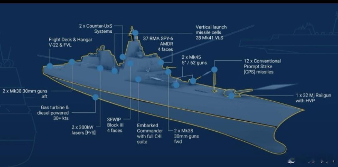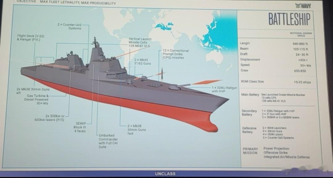 一艘有前景的特朗普型美国导弹战列舰。特别指出,拥有12枚CPS高超音速导弹(作为常规即时打击计划的一部分——非核即时打击)、128个Mk41垂直发射器、300千瓦或600千瓦激光器,以及一门容量为32兆焦耳的电磁轨道炮。采用燃气轮机/柴油机动力。军舰的人数为650-850人