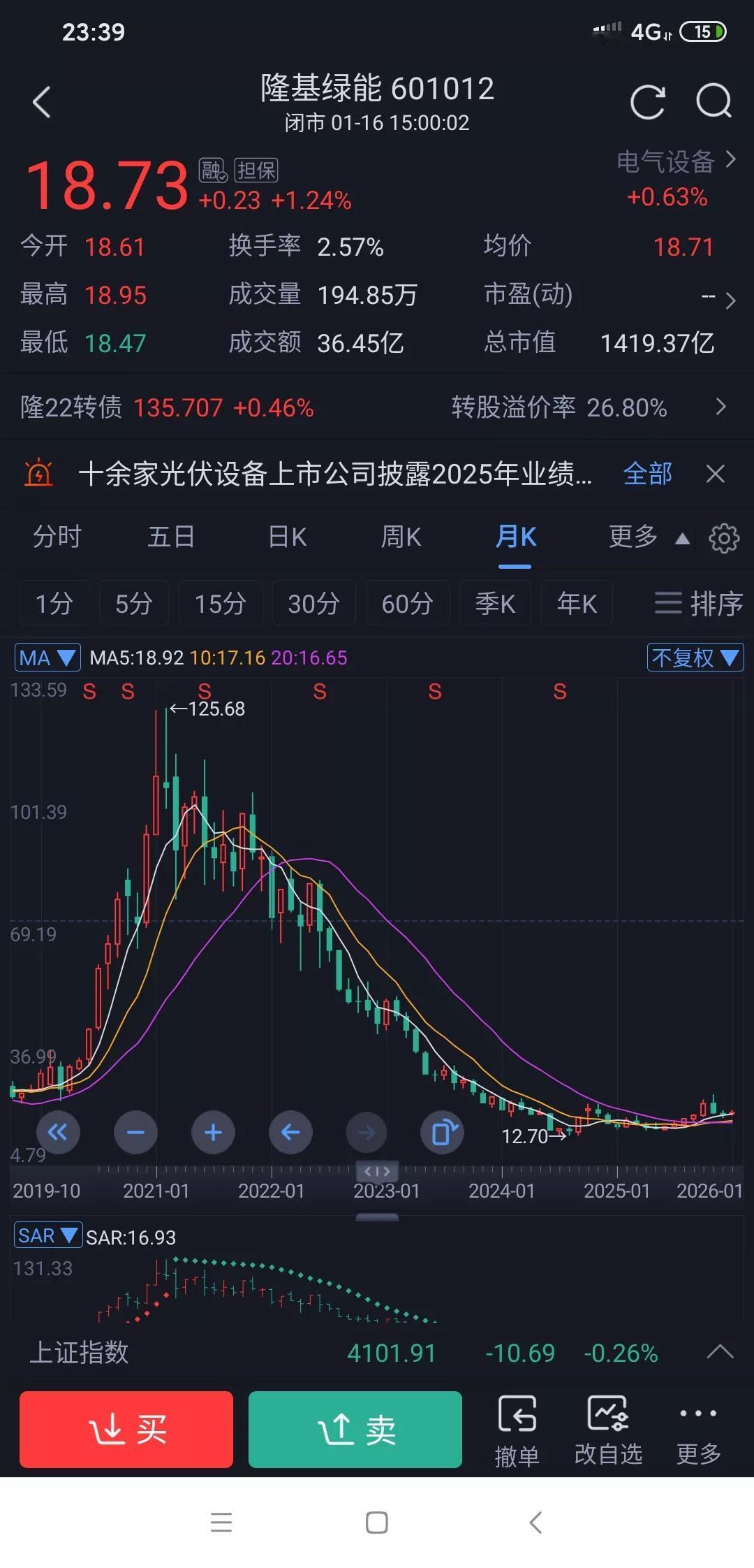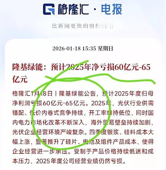 隆基绿能业绩暴雷? 18日公告说2025年预计亏损约65亿,之前钟总还说预计25年能扭亏为盈呢,这下脸可被打得“啪啪”响。看来只能看26年能不能扭亏为盈了。 25年一季度亏约14亿 二季度约亏11亿 三季度约亏8亿 四季度约亏30亿 1.2.3季度亏损越来越少了,都想着四季度能继续少亏,或者不亏,没想到直接顶上前三个季度亏损了。 业绩暴雷这意味着公司的发展状况远没有预期那么好。不少投资者们估计心里都凉了半截,原本盼着扭亏赚钱,现在却等来这么个坏消息。 不过钟总说了最困难的时候已经过去, 以后只会更好,期望隆基早日王者归来。