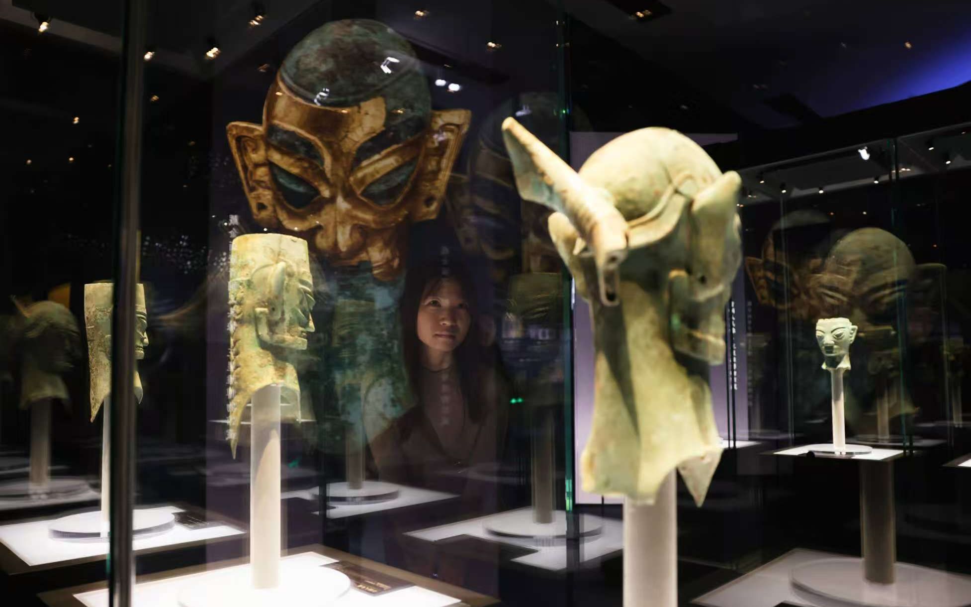嘉宾参观三星堆遗址出土的青铜人面具。新京报记者浦峰摄