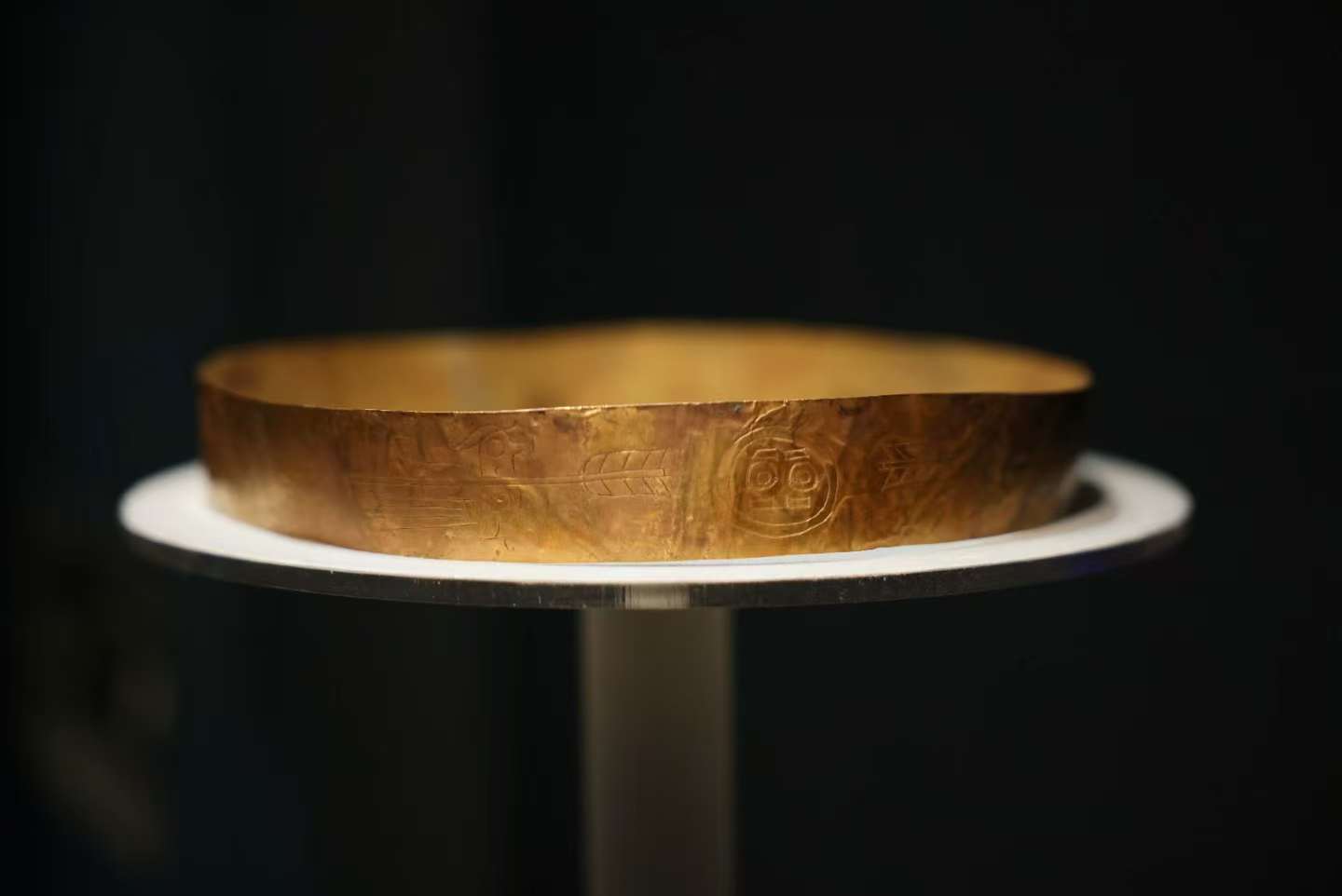 此次领衔展出的成都金沙遗址博物馆镇馆之宝太阳神鸟金饰,于2001年四川成都金沙遗址祭祀区出土,整器呈现圆环形,器身很薄。镂空图案分内外两层,内层为周围等距分布十二条顺时针旋转的齿状芒;外层图案围绕着内层图案,由四只造型相同、首足前后相接、按逆时针方向飞行的飞鸟组成。器物含金量高达94.2%,是古蜀国黄金工艺辉煌成就的代表。