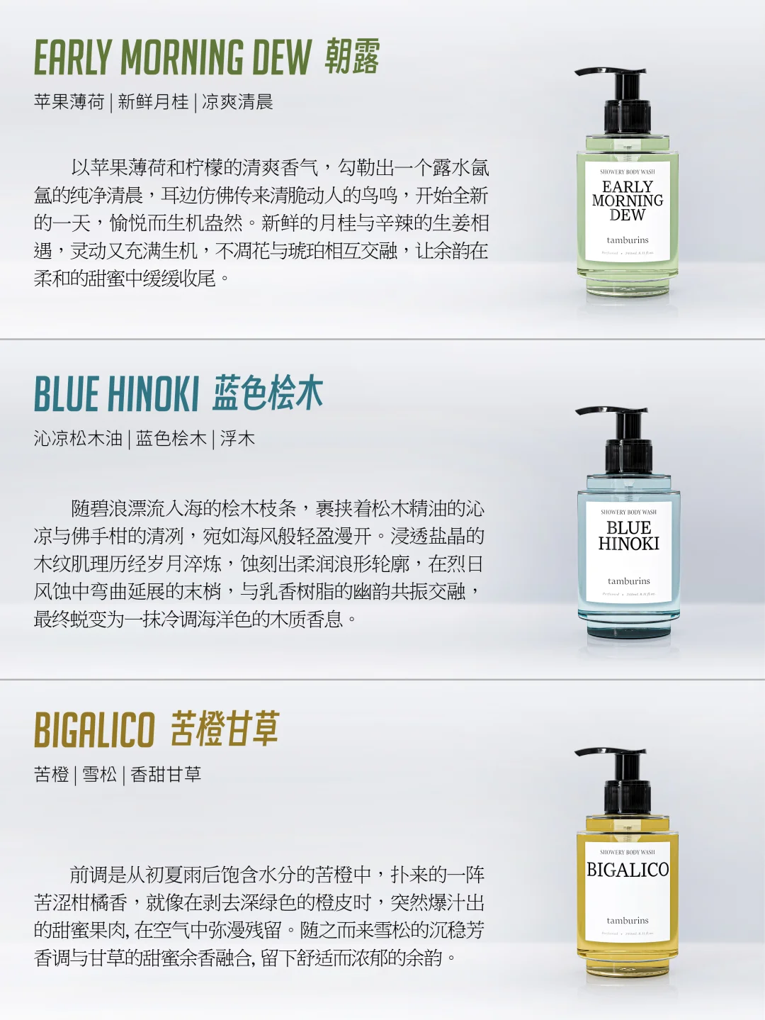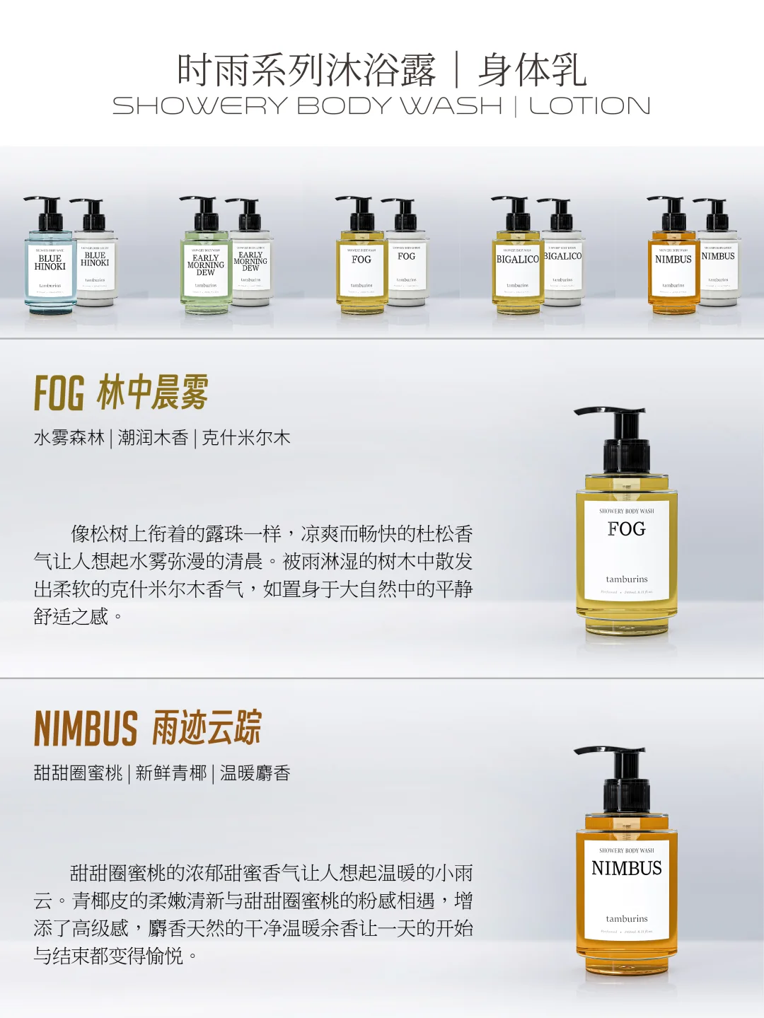 ⑥ 时雨身体护理系列:包含香氛沐浴露和香氛身体乳,以“大自然的降雨”为灵感调香。