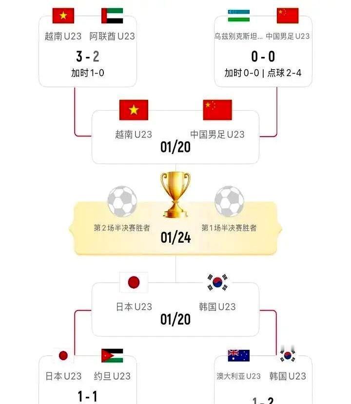 东亚四强包圆U23亚洲杯 史上头一回,沙特成了东亚后花园。中国、越南、韩国、日本把半决赛打成自家联赛。 1月17日夜,李昊扑掉乌兹别克点球那一刻,现场沙特球迷安静得像停电。四场零封后,他成了队里最贵的人——不是转会费,是队友集体把球衣扔给他留纪念。 安东尼奥的套路简单:先扎篱笆,再偷鸡。球权给你,射门没门。小组赛对澳大利亚,控球三七开,一脚反击就带走三分。球迷骂他踢得丑,他只回一句:赢球的票根比控球率好看。 越南3比2加时干掉阿联酋,韩国2比1磨死澳大利亚,日本点球气走约旦。三队剧本不同,结局一样:东亚球队把西亚技术流熬到腿软。 1月20日半决赛,中国碰越南。上次热身赛输过0比2,这次再见面,李昊说想请对方前锋喝七喜。韩国打日本更刺激,谁赢谁直接预定决赛门票。 踢到这个份上,技术统计都是给输家看的。体能、心态、门将神经,才是东亚内战的三把刀。