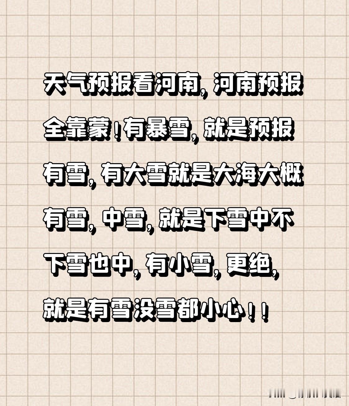 天气预报看河南,河南预报全靠蒙!有暴雪,就是预报有雪,有大雪就是大海大概有雪,中雪,就是下雪中不下雪也中,有小雪,更绝,就是有雪没雪都小心!!