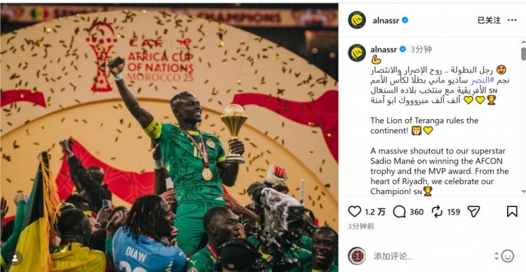 利雅得胜利官方社媒晒出马内捧杯的照片,对他表示祝贺,配文:“特兰加雄狮统治非洲大陆!”