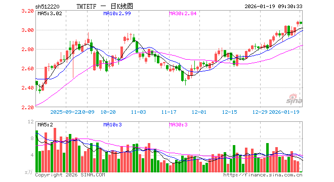 1月19日,TMTETF(512220)开盘涨0.03%,报3.080元。TMTETF(512220)重仓股方面,新易盛开盘跌1.25%,中际旭创跌1.94%,立讯精密涨0.03%,中芯国际涨0.05%,寒武纪跌0.14%,工业富联跌1.41%,海光信息涨0.68%,北方华创涨1.15%,澜起科技跌0.76%,胜宏科技跌3.97%。