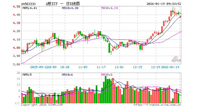 1月19日,A股ETF(563330)开盘跌0.84%,报4.361元。A股ETF(563330)重仓股方面,贵州茅台开盘跌0.01%,宁德时代跌0.24%,中国平安跌0.08%,紫金矿业涨0.40%,海光信息涨0.68%,中际旭创跌1.94%,新易盛跌1.25%,恒瑞医药跌0.23%,美的集团涨0.08%,东方财富跌0.38%。
