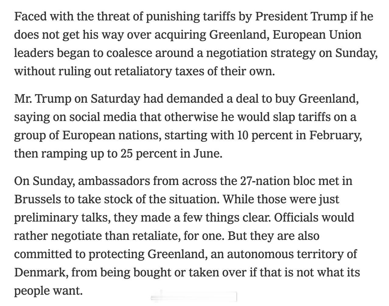 关于格陵兰问题的追踪报道:面对川普的威胁,欧洲更倾向于谈判,而不是立即反制:周日,来自27个欧盟成员国的大使在布鲁塞尔会面,评估当前局势。尽管这只是初步磋商,但已经释放出几项明确信号:首先,欧洲官员更倾向于谈判,而不是立即反制;但与此同时,他们也明确表示,如果格陵兰民众并不支持,欧盟将致力于保护格陵兰不被购买或接管。两名了解讨论情况的外交官透露,如果华盛顿继续升级施压,欧洲方面也可能考虑进行反击。欧洲官员正在考虑的一种方案是,允许一份总额约930亿欧元的报复性关税清单在2月生效。此外,一些欧洲议会议员以及法国总统马克龙还提出,欧盟应启用一种更为激进的办法,专门用于应对经济胁迫。这一选项的正式名称是“反胁迫工具”,非正式说法则是欧洲贸易领域的“火箭筒”,它可以被用来对在欧洲拥有大量业务的美国大型科技公司或其他服务提供商施加限制。但外交官们表示,这不会是首选方案,因为这可能导致冲突进一步升级。尽管许多欧洲领导人仍希望通过沟通解决问题,但截至目前,相关磋商几乎没有取得实质进展。海外新鲜事热点现场今日热点