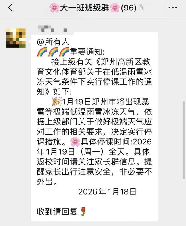 截至1月18日20点,郑州高新区、经开区、二七区、惠济区、金水区、航空港区家长已接到通知,1月19日(周一)中小学、幼儿园全天停课。