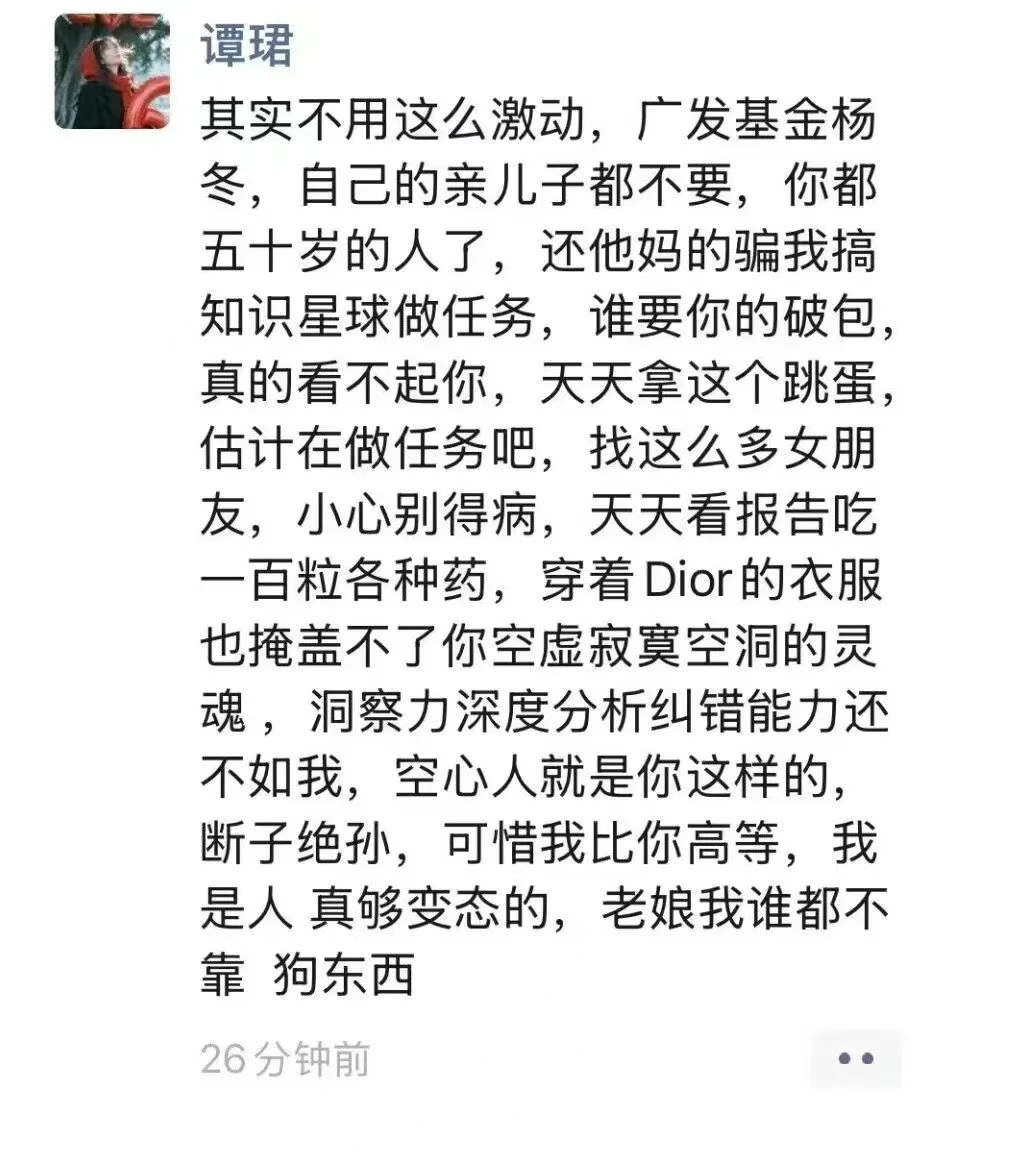 在杨冬始终沉默的另一端,谭珺不仅公开了据称由“上海生物科技有限公司”出具的产前亲子鉴定报告,还披露这位50岁的基金经理曾以合作为名诱导她参与所谓的“知识星球做任务”。