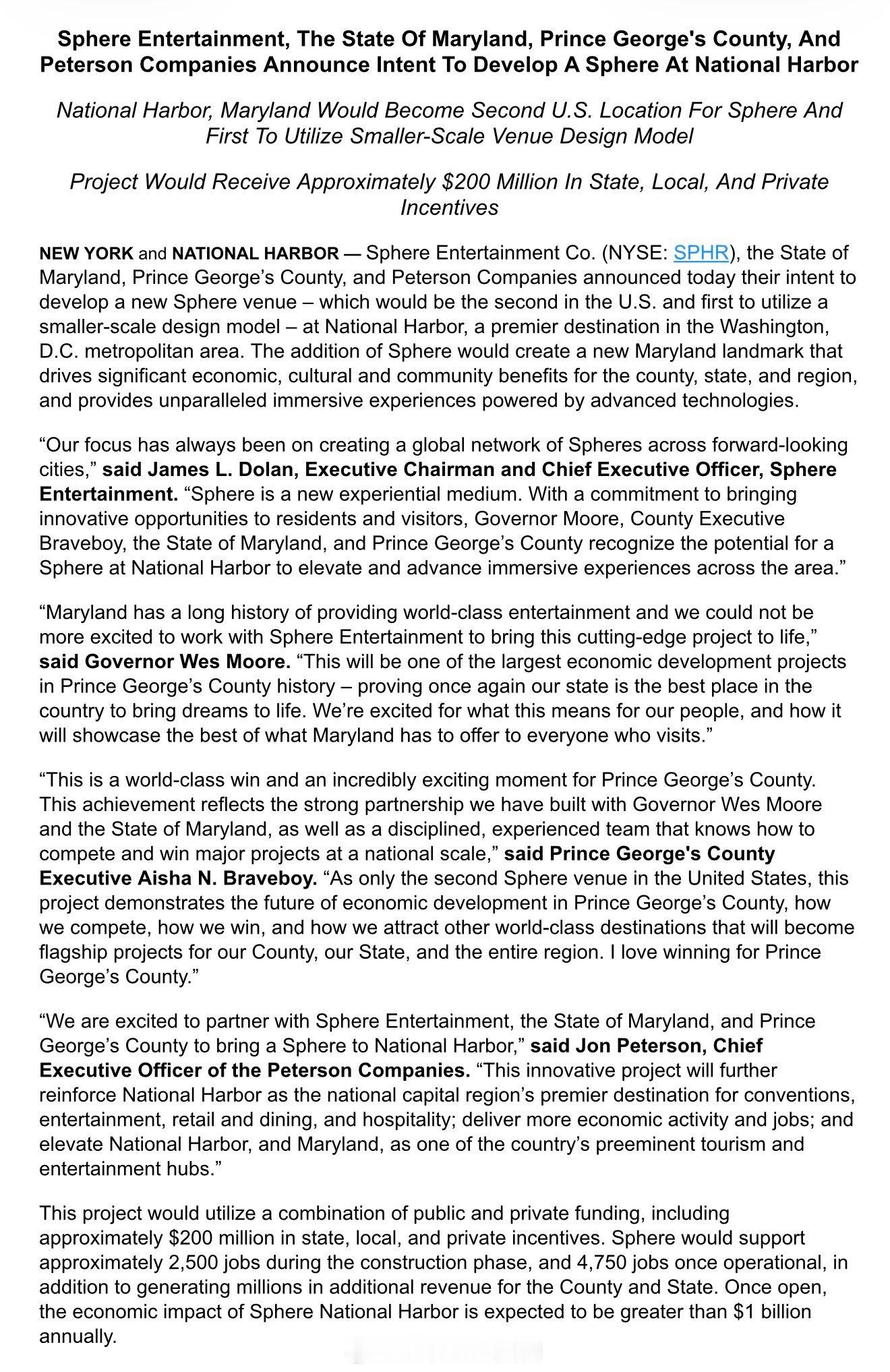 马里兰州国家港(National Harbor)将开设继拉斯维加斯之后,美国第二个Sphere,比拉斯维加斯的小,6000个座位于音乐会和各类活动。该项目获得了来自州、地方及私人方面总计2亿美元的支持,预计将带2500个建筑施工岗位、4750个运营岗位,并为大华盛顿地区创造超过10亿美元的年经济效益。海外新鲜事热点现场