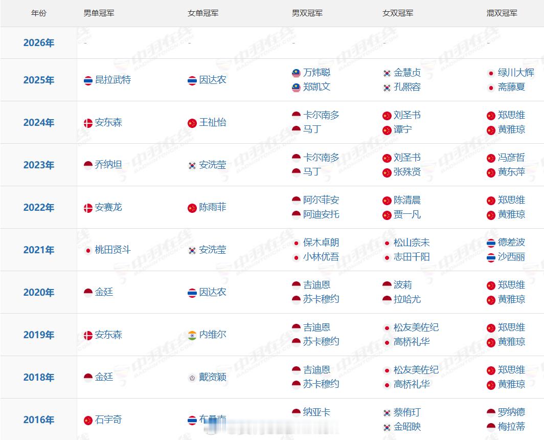 2026年印尼羽毛球大师赛上届/近10年卫冕冠军🏆男单:昆拉武特🇹🇭女单:因达农🇹🇭男双:万炜聪/郑凯文🇲🇾女双:金慧贞/孔熙容🇰🇷混双:绿川大辉/斋藤夏🇯🇵 ⭐初步签表:网页链接【已知凤凰组合已退】新年快乐羽毛球