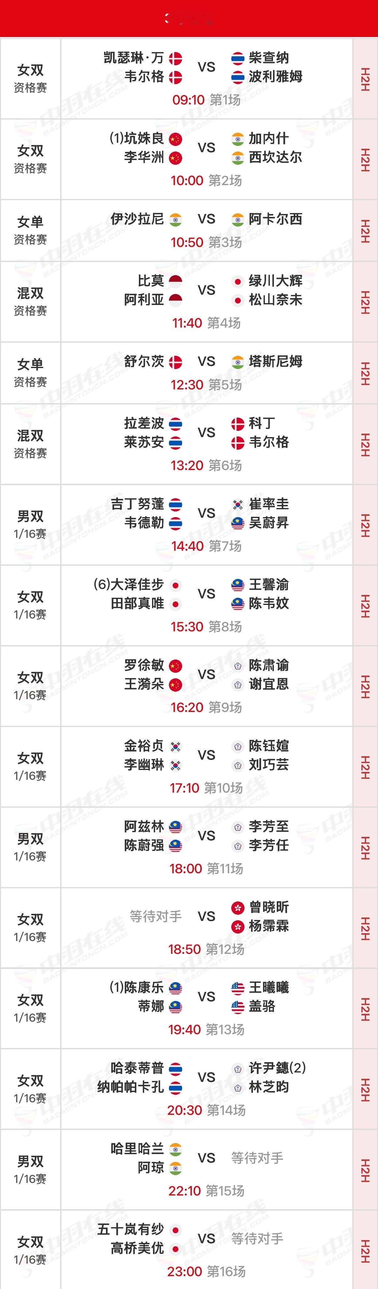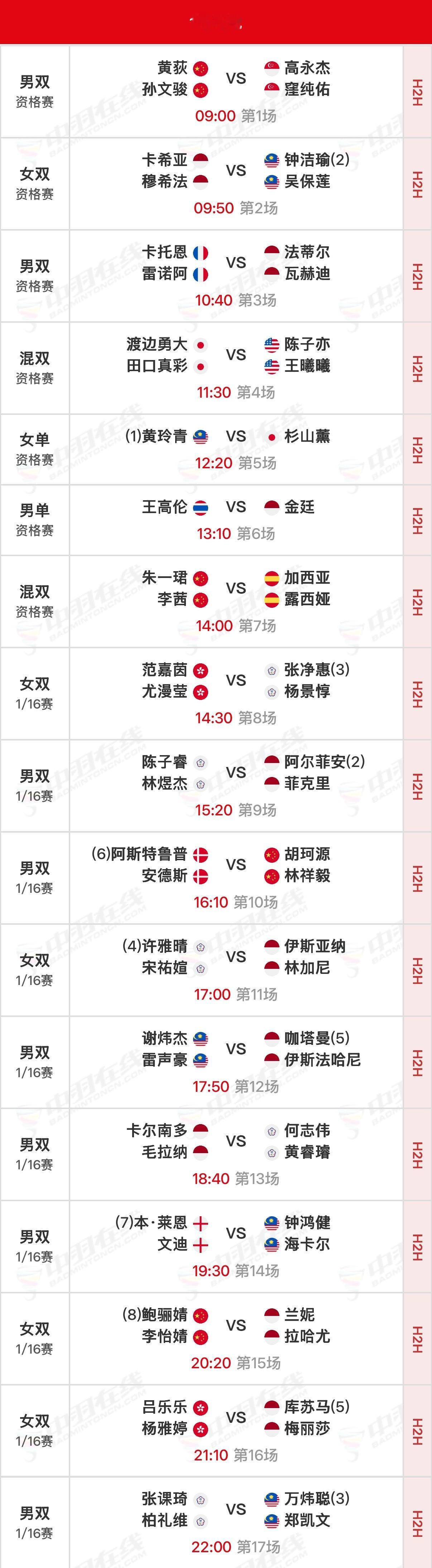 2026年印尼羽毛球大师赛 首日赛程资格赛09:00开始,正赛14:30开始,可在央视频、羽协公众号/视频号、优酷观赛实时比分:网页链接官方赛程:网页链接【一号场地】①🇨🇳黄荻/孙文骏vs高永杰/窪纯佑🇸🇬(资格赛)⑦🇨🇳朱一珺/李茜vs加西亚/露西娅🇪🇸(资格赛)⑩🇨🇳胡珂源/林祥毅vs阿斯特鲁普/拉斯姆森🇩🇰⑮🇨🇳李怡婧/鲍骊婧vs兰妮/拉哈尤🇮🇩【二号场地】③🇨🇳陈旭君/刘阳vs陈政宽/林秉纬ᴛᴘᴇ(资格赛)⑦🇨🇳胡哲安vs朱利安🇧🇪(资格赛)【三号场地】②🇨🇳坑姝良/李华洲vs西坎达尔/加内什🇮🇳(资格赛)⑨🇨🇳罗徐敏/王漪朵vs陈素谕/谢宜恩ᴛᴘᴇ