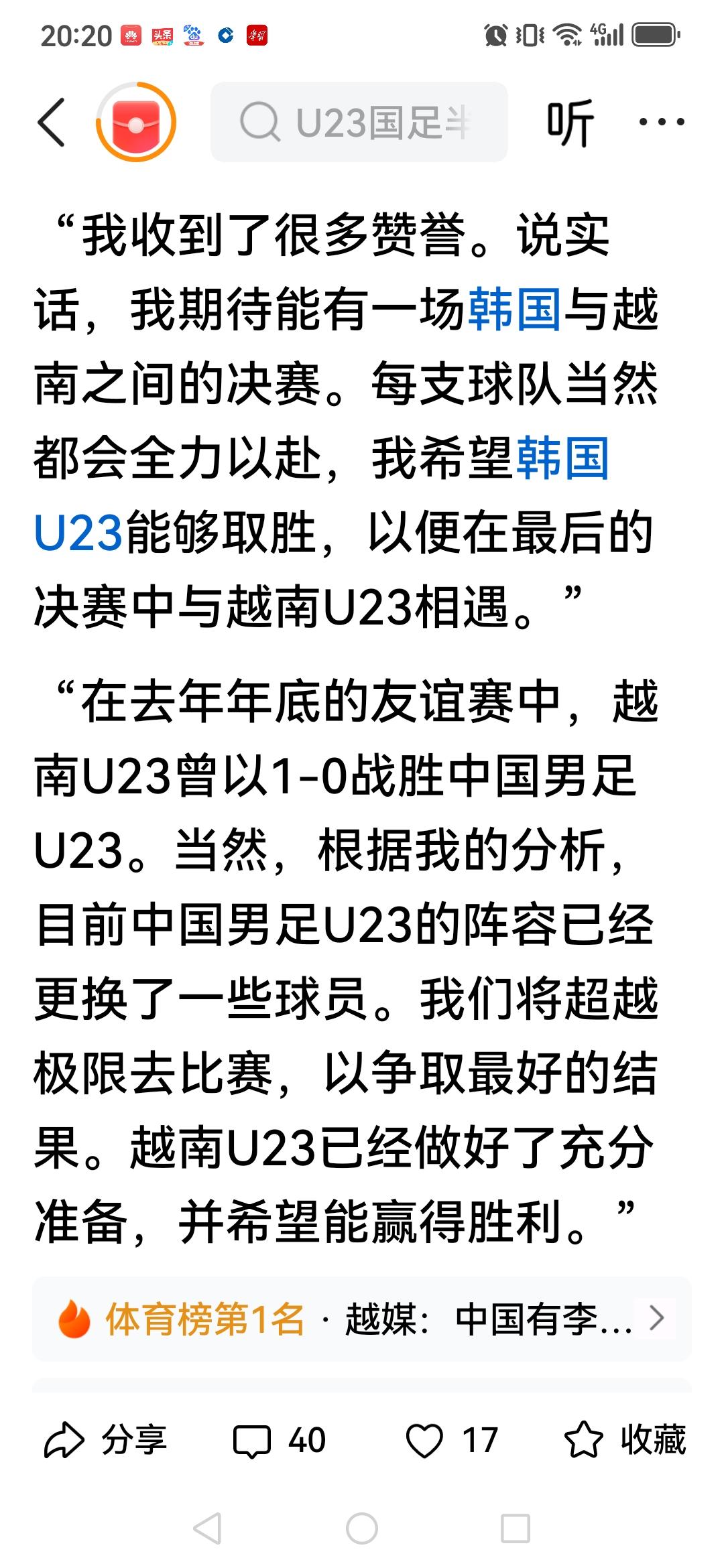 越南队主帅金相植在新闻发布会上公开叫嚣:期待越南队和韩国队会师∪23亚洲杯决赛,直接否决了多数球迷让中国队与日本队争冠的期待。 在绝大多数人看来,日本u20打u23亚洲杯,也是独一档的存在,但金相植是韩国人,即便打工在外也不忘对母国的爱。另一方面,此金一如既往瞧不上我们的国足,还拿去年末越南∪23队1:0战胜我们的∪23来表明高傲的姿态。 虽然老金说的是事实,但足球比赛从来不会重复历史,更不是靠嘴巴来嗨。我的预测恰恰与他的说法相反,∪23亚洲杯大概率就是中日挺进决赛。期待安东尼奥的队伍从渐热到大热,让这狂妄的金相植下不来台。[大笑]