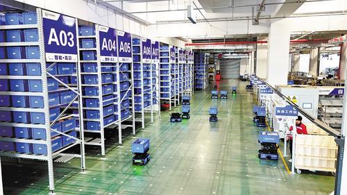 近日,智能机器人在固安县宏贤达科技集团有限公司的电商云仓内转运图书。