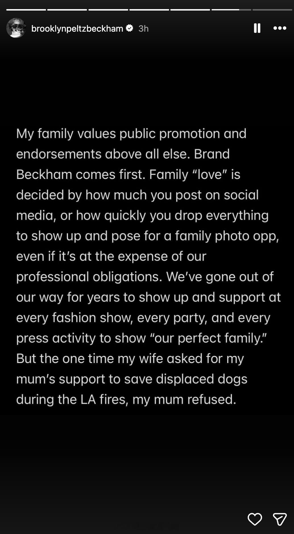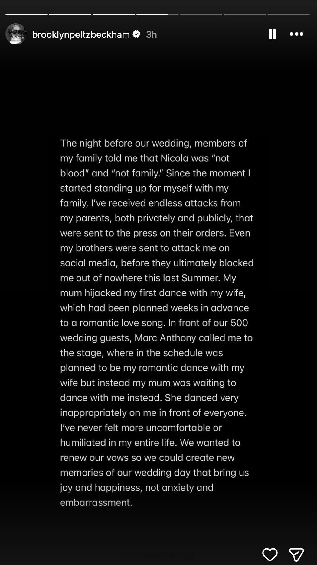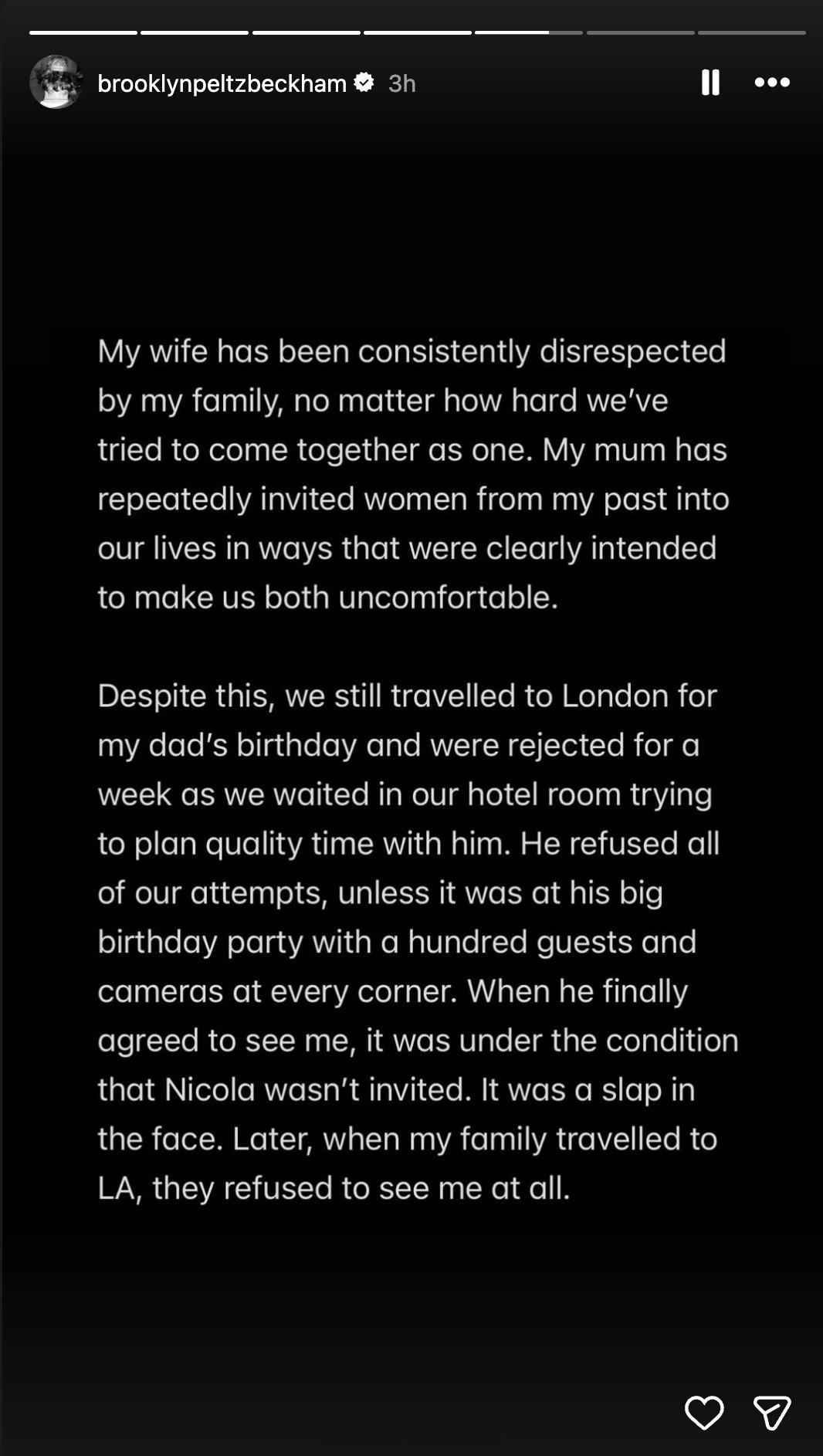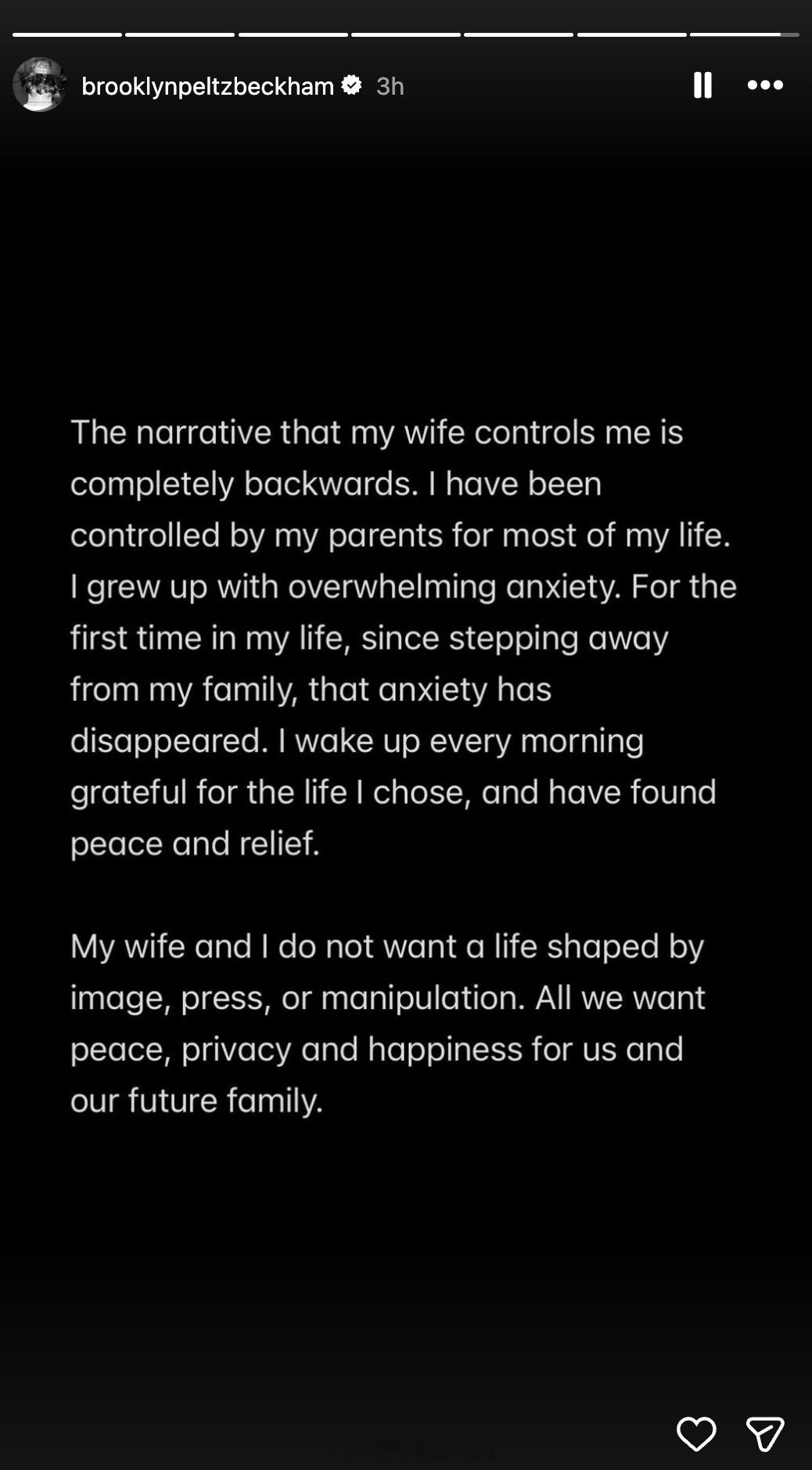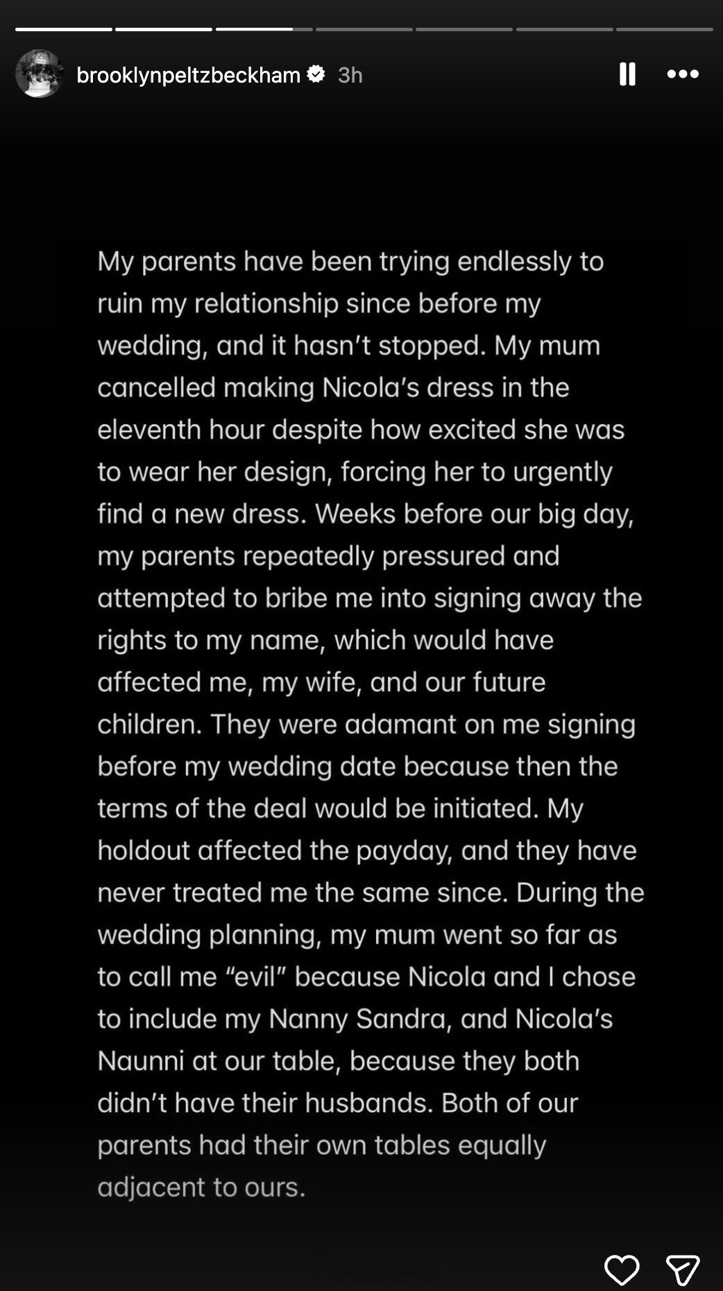 贝克汉姆的儿子布鲁克林今天在Instagram 上发布长文,讲述他与父母贝克汉姆和维多利亚关系破裂一事:“这些年来我一直保持沉默,也竭尽全力想把这些事情留在私下处理。可遗憾的是,我的父母以及他们的团队不断向媒体放料,让我别无选择,只能站出来为自己发声,讲清楚一些已经被刊登出来的谎言中的一部分。我并不想和家人和解。我没有被任何人操控,这是我人生中第一次真正为自己站出来。从我有记忆开始,我的父母就一直在媒体上掌控着我们这个家庭的叙事。那些表演式的社交媒体发文、家庭活动,以及并不真实的关系,都是我出生后所进入的那种生活的一部分。最近,我亲眼看到了他们为了维持自己的假象,能把多少谎言塞进媒体里,而且往往是以无辜的人为代价。但我始终相信,真相终究会浮出水面。从我结婚之前开始,我的父母就一直试图破坏我的感情关系,这种行为从未停止。我母亲在最后一刻取消了为 Nicola 制作婚纱的安排,明明她之前对穿上那件设计兴奋不已,结果逼得她不得不紧急另找一件婚纱。在婚礼前的几周里,我的父母一再向我施压,甚至试图用钱收买我,逼我签署文件,放弃我名字的相关权利。这份协议一旦生效,不仅会影响我本人,也会影响我的妻子以及我们未来的孩子。他们坚持要我在婚礼之前签字,因为那样协议条款就能立刻启动。我拒绝配合,影响了他们的收益,从那以后,他们对我的态度就再也没变好过。在我们婚礼前一晚,家里有人直接对我说,Nicola‘不是血亲’,‘不算家人’。自从我开始在家里为自己争取立场以来,我就不断遭到父母的攻击——无论是私下的还是公开的,而这些内容都在他们的授意下被送进了媒体。甚至连我的兄弟们,也被指使在社交媒体上攻击我,直到去年夏天某一天,他们毫无征兆地把我拉黑。无论我们多么努力想和家人好好相处,我的妻子始终遭到我家人的不尊重。我母亲多次把我过去的女性带入我们的生活,而且方式明显就是为了让我们两个人都感到不舒服。即便如此,我们还是去了伦敦为我父亲过生日,却在酒店里等了一整周,被拒之门外,试图安排和他单独相处的时间。他拒绝了我们所有的请求,除非是在他那场有上百名宾客、到处都是摄像机的大型生日派对上。后来他终于同意和我见面,前提却是 Nicola 不能出席,那对我来说简直是当头一棒。再后来,我的家人去了洛杉矶,却干脆完全不肯见我。说我被妻子控制的那种说法,完全是颠倒黑白。事实上,我人生中大部分时间都被父母控制着。我从小就在极度焦虑中长大。离开我的家庭之后,这是我人生中第一次,那种焦虑彻底消失了。我每天早上醒来,都感激自己做出的选择,也终于找到了平静与解脱。我和妻子不想要一种被形象、公关或操纵所塑造的人生。我们只希望拥有属于我们自己、以及未来家庭的平静、隐私和幸福。”贝克汉姆海外新鲜事热点现场