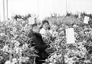 近日,在位于周宁县浦源镇的宁德向山兰园植物科技有限公司花卉大棚内,周宁县花卉办工作人员(左)与企业管理人员查看大花惠兰长势。