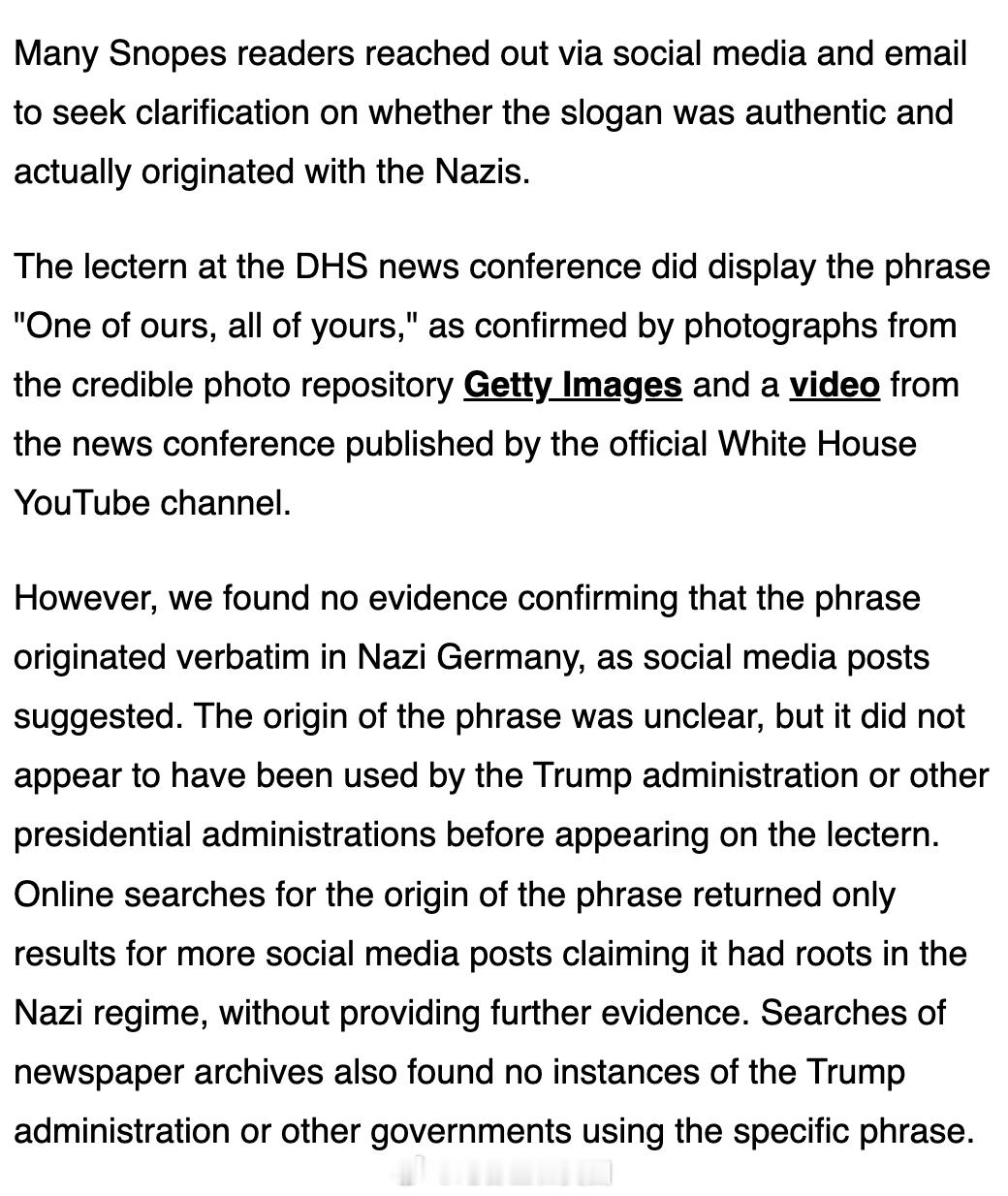 Snopes难得帮川普政府辟谣,国土安全部使用的“one of us, one of yours”不是纳粹口号:“我们没有找到任何证据能能证实这句话确实一字不差地起源于纳粹德国,尽管社交媒体上有这样的说法。该表述的来源并不清楚,而且在它出现在讲台上之前,看起来并未被川普政府或其他历届美国政府使用过。对这句话来源的网络搜索,几乎只得到更多声称其根源来自纳粹政权的社交媒体帖文,但都没有提供进一步的证据。查阅报纸档案也没有发现川普政府或其他政府使用过这一特定措辞的记录。”海外新鲜事热点现场今日热点