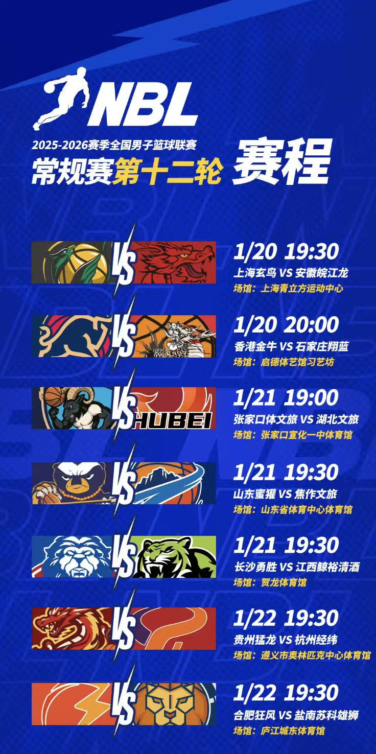 虎扑01月20日讯NBL社媒分享第十二轮最新赛程:香港金牛、上海玄鸟今日出战。