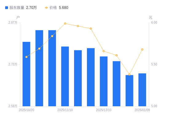日期A股户数(户)流通A股户均持股数(股)户均持股市值(万元)2026-01-092700123523.7413.362025-12-312694423573.5012.682025-12-202741023172.7213.002025-12-102757023038.2413.042025-11-282784722809.0813.532025-11-202777822865.7313.632025-11-102790322763.3013.642025-10-312845022325.6413.042025-10-302845022325.6412.702025-10-202805922636.7412.65