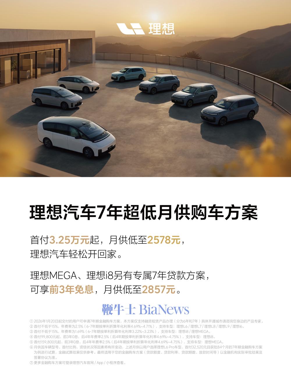 据介绍,2026年1月20日起购买理想汽车,可享7年超低月供购车方案:首付3.25万元起,月供低至2578元。据介绍,理想MEGA、理想i8车型另有专属7年贷款方案,可享前3年免息,月供低至2857元。